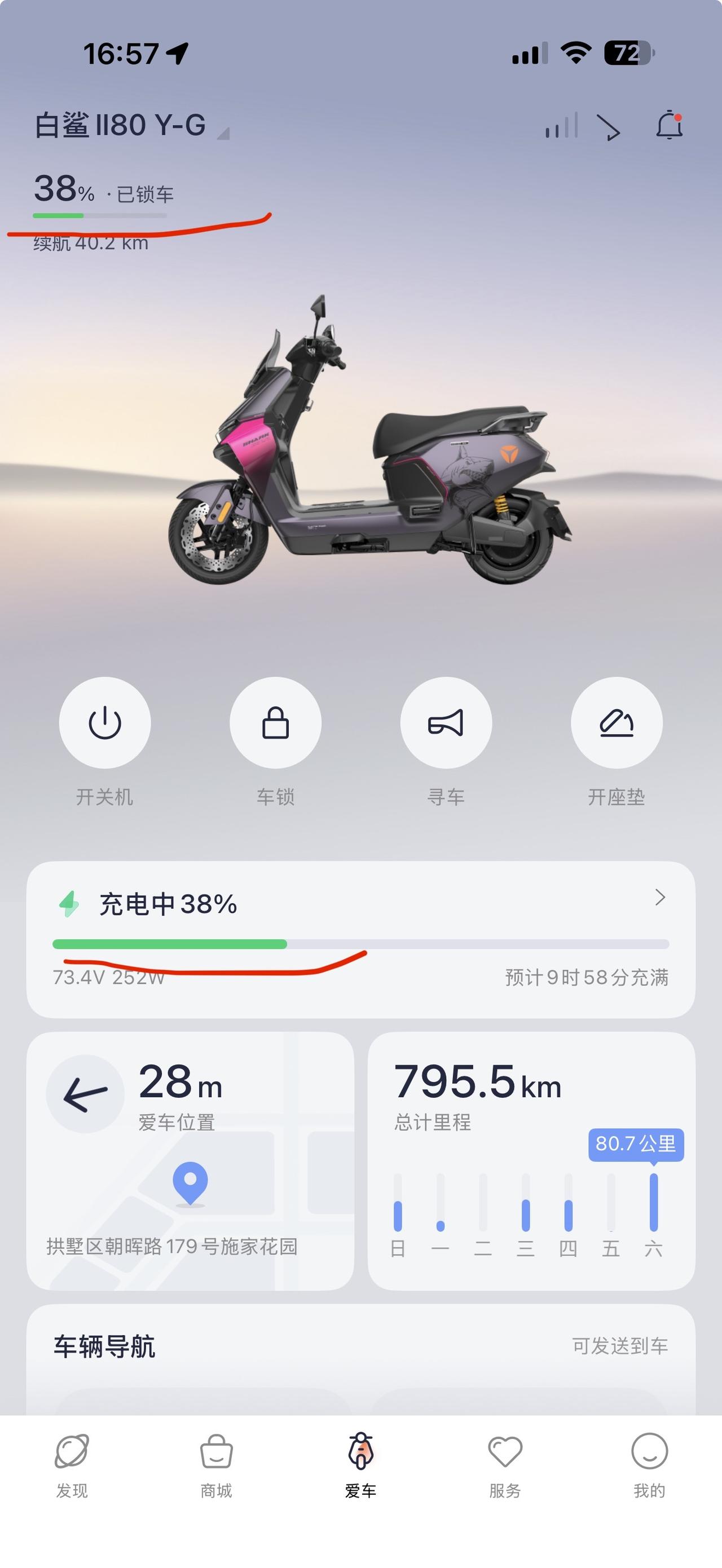 骑行80千米还剩38%电量,导航很好用,喇叭一路歌声,雅迪电自白鲨二代品质杠杠的!