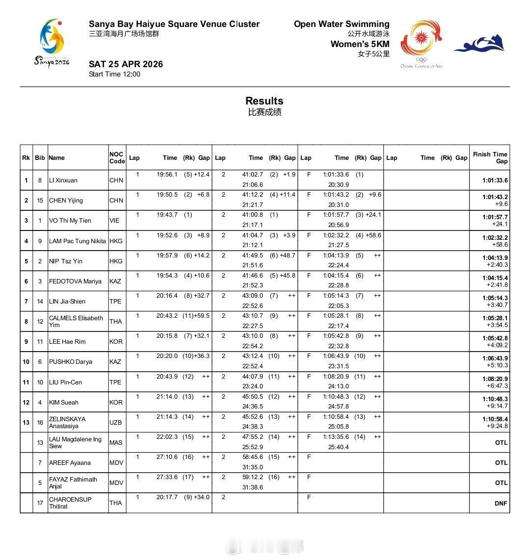 亚沙会 中午结束的公开水域女5km项目,李馨璇和陈奕静包揽金银牌🥇🥈恭喜!