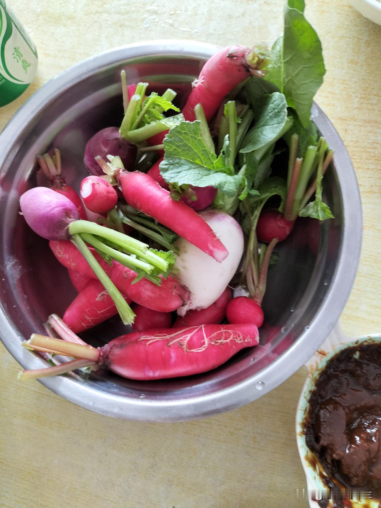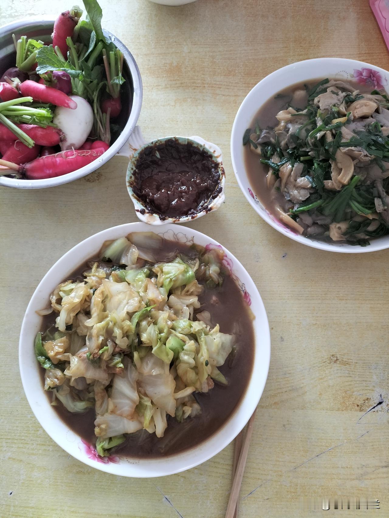 上午去菜园子里边拔了萝卜,又掰了点生菜,叶子留着蘸酱吃,也算凑合一个菜吧。