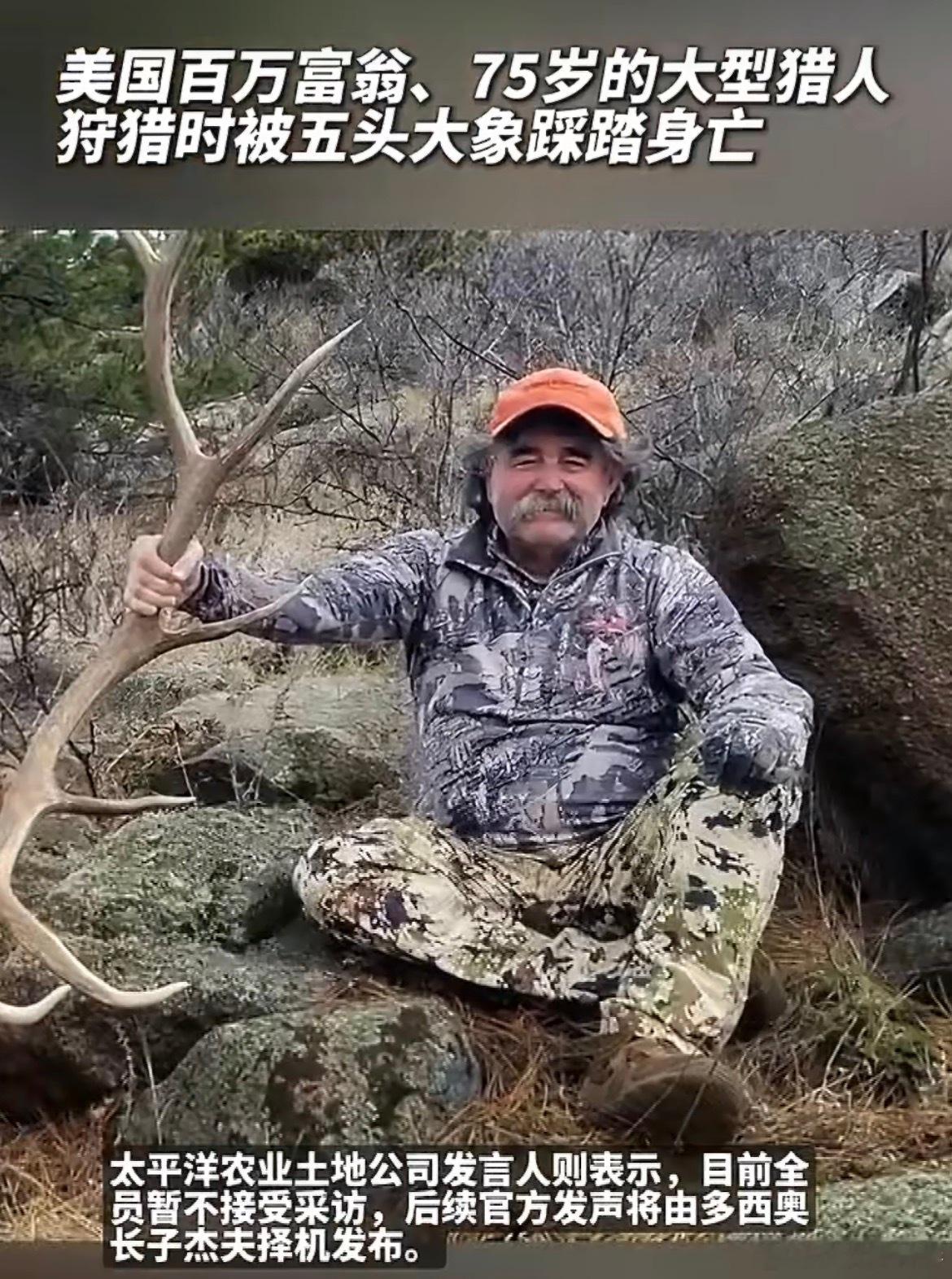 花巨资去非洲打猎的美国葡萄酒大亨,拥有50多年狩猎经验,家中陈列室摆满大象、犀牛等上百件“战利品”。在加蓬雨林狩猎羚羊时,误闯象群领地,为保护幼象的5头母象暴怒冲出,将其当场踩踏身亡。这一悲剧再次提醒,对生命缺乏敬畏,终将付出代价。
