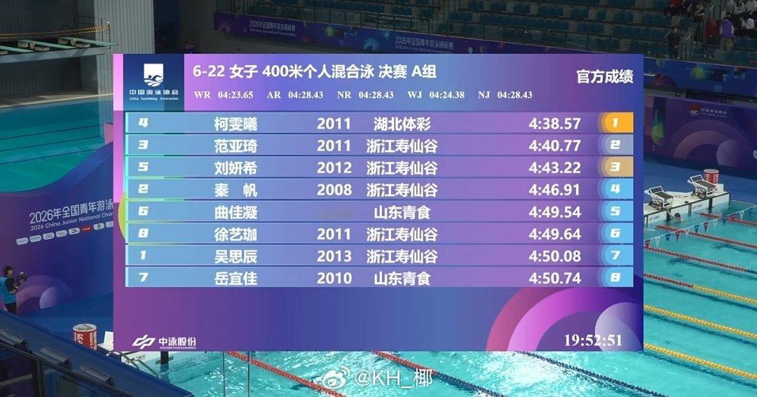 全国青年游泳锦标赛 女400混决赛柯雯曦 4:38.57范亚琦 4:40.77 PB刘妍希 4:43.22