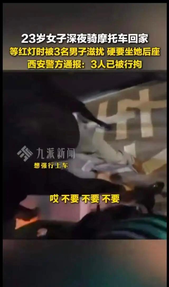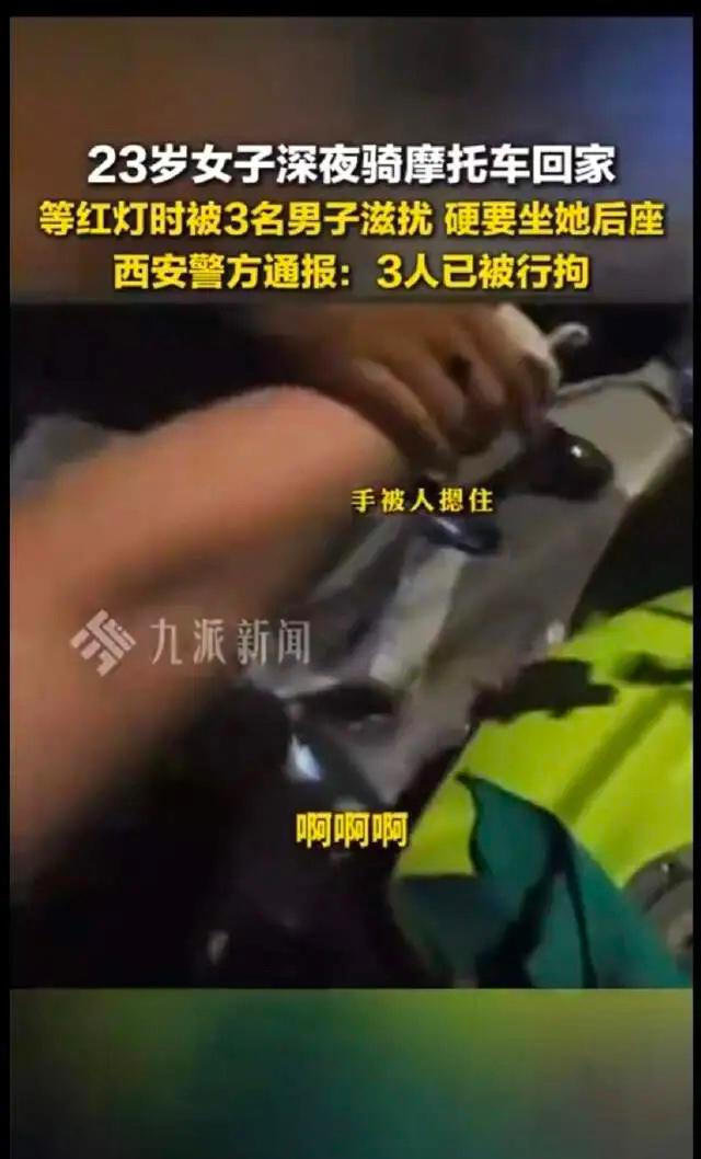 西安,一名年轻女孩骑摩托车在深夜被三名醉酒男子强行拦在路口,并将女孩团团围住,三