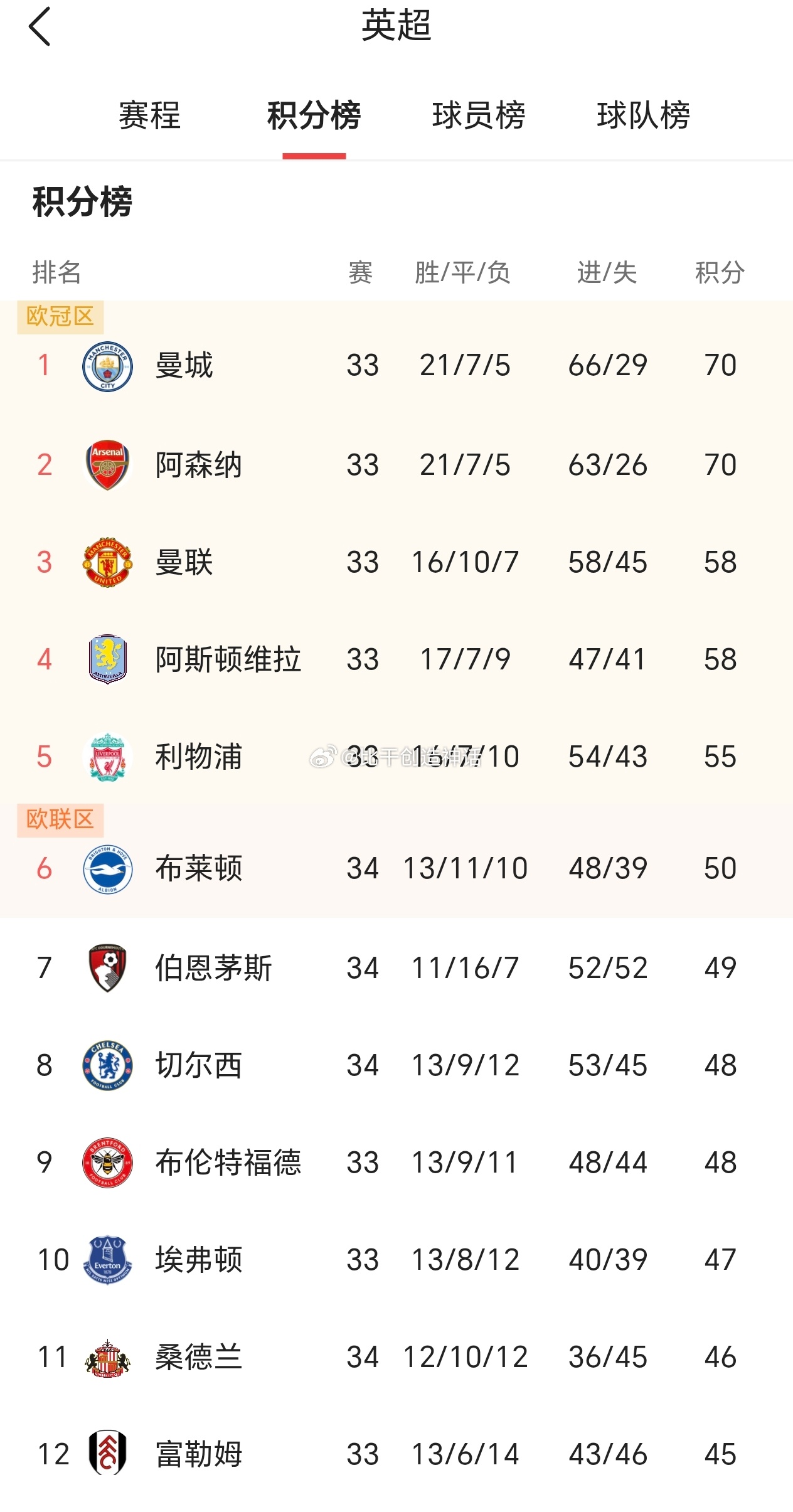 随着曼城以哈兰德的一个进球赢了伯恩利,曼城暂时登顶,跟阿森纳同分同净胜球,仅以进球数领先,现在在同一起跑线,双方还剩5场比赛,每一场都直接影响冠军归属,双方每一场都是焦点战。争五六行列也很焦灼,切尔西感觉要掉了。保级区同样精彩,热刺踢不踢英冠就看这几场比赛了。所以这就是英超。英超 曼城阿森纳热刺