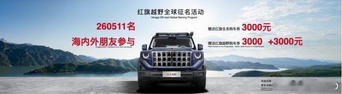 去年,共有260511位海内外朋友热情参与了红旗品牌发起的红旗越野“全球征名活动”,为了感谢众多海内外朋友对“红旗”的热爱和关注,红旗品牌将为每位参与者赠送3000元红旗全系购车券,若购买红旗越野,可额外再享3000元加赠!