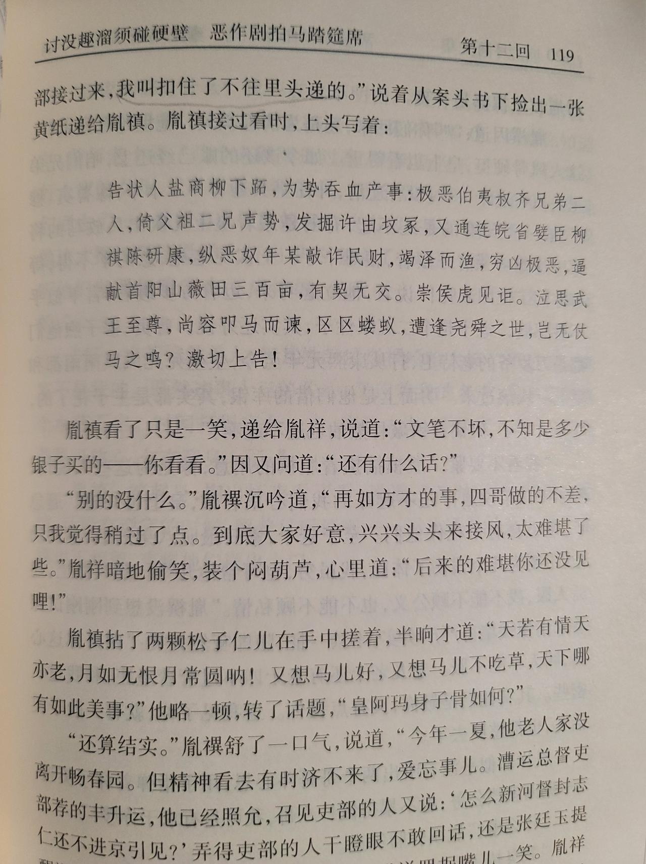 今天重复二月河先生的著作《雍正皇帝》九子夺嫡卷。这一节写的是康熙朝,胤禛和胤祥正奉命到江南扬州,清理盐商的国库亏空、追讨欠款。盐商们欠了朝廷巨额银子,被胤禛、胤祥的强硬手段逼得走投无路,于是写了一篇用典故隐语的告状信,把胤禛、胤祥骂成强抢民财的恶徒。