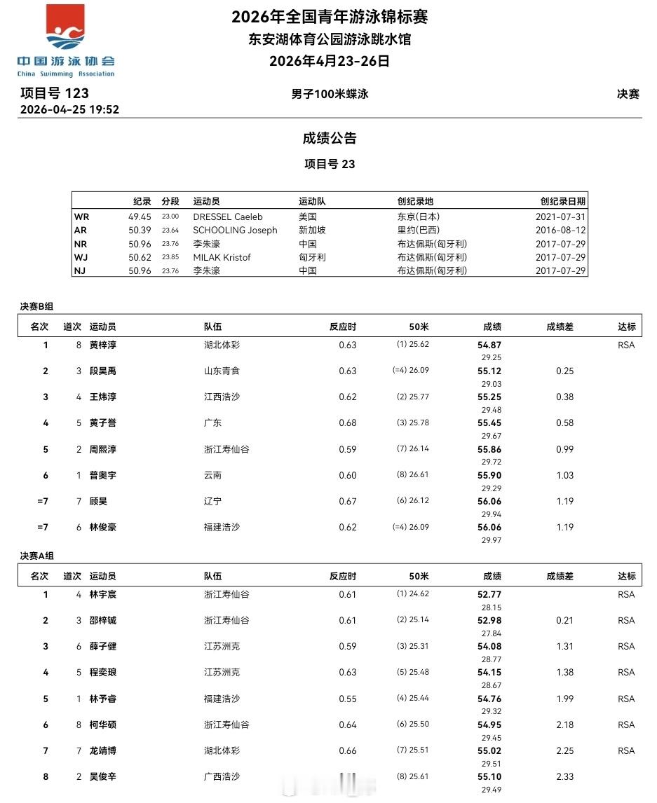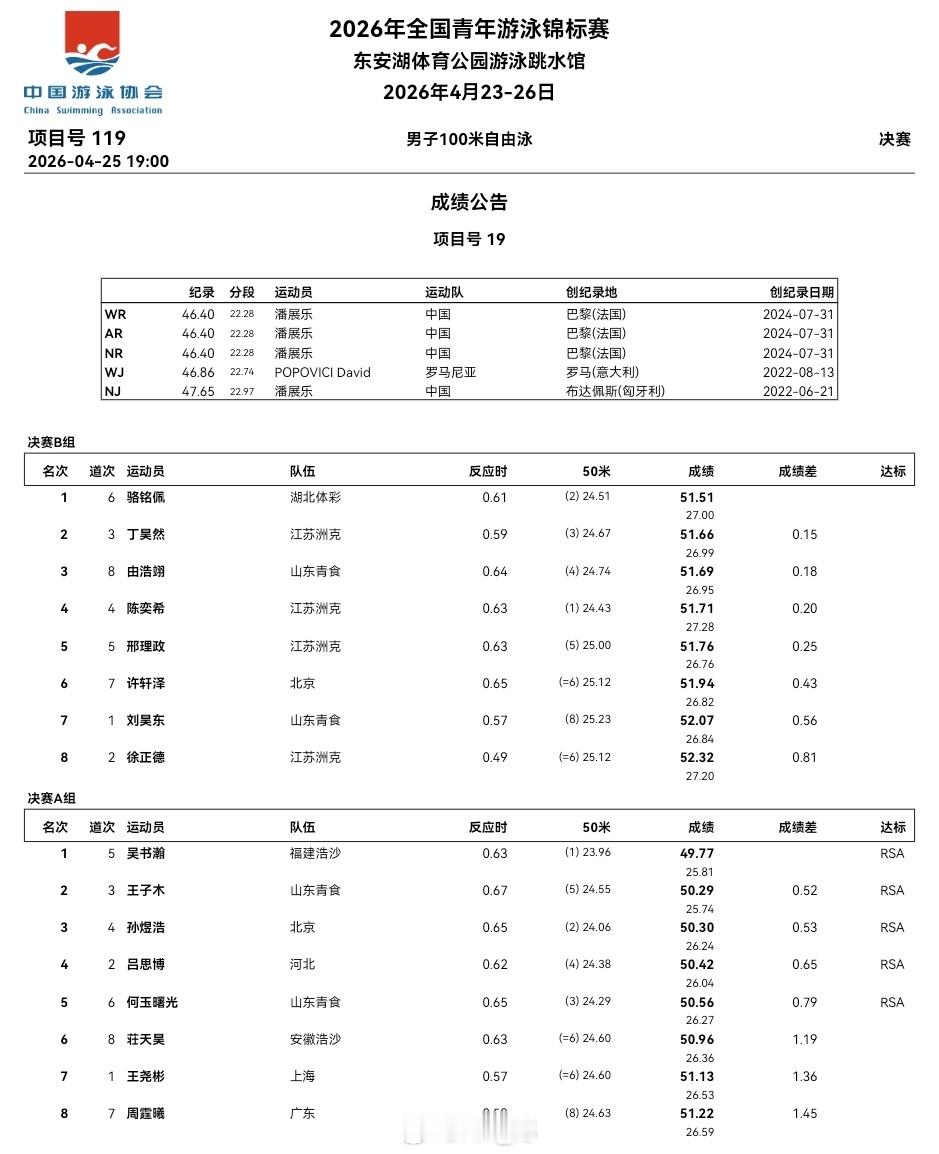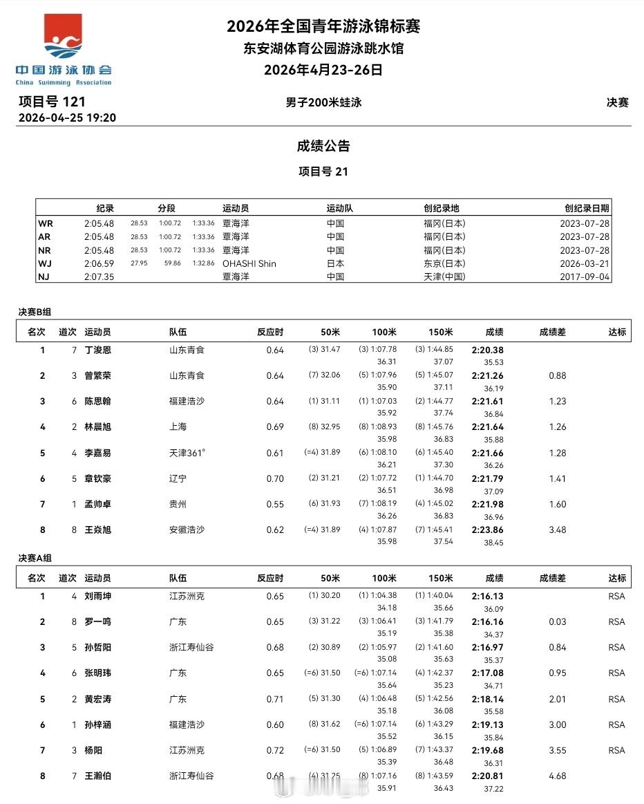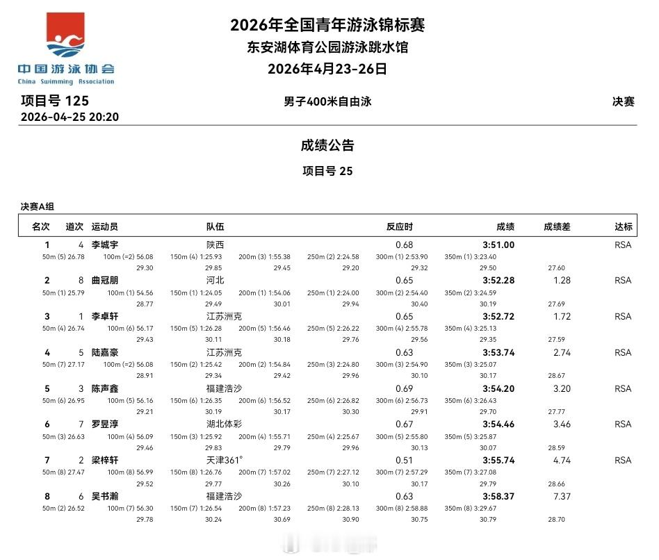 全国青年游泳锦标赛 第三天决赛成绩公告