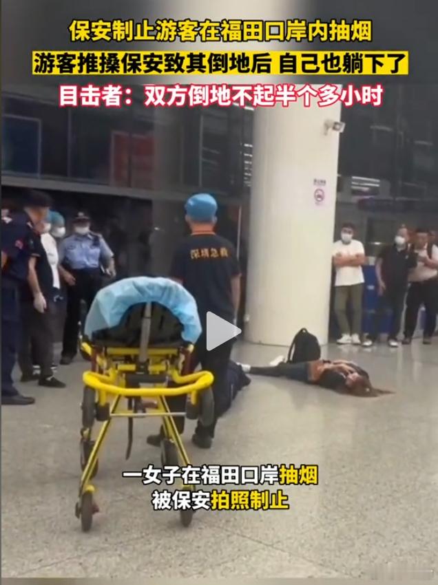 女子抽烟,保安拍照制止女子推搡保安,保安直接往地上一躺
