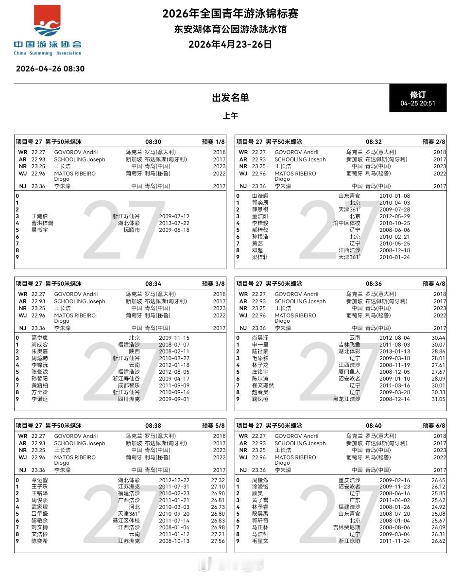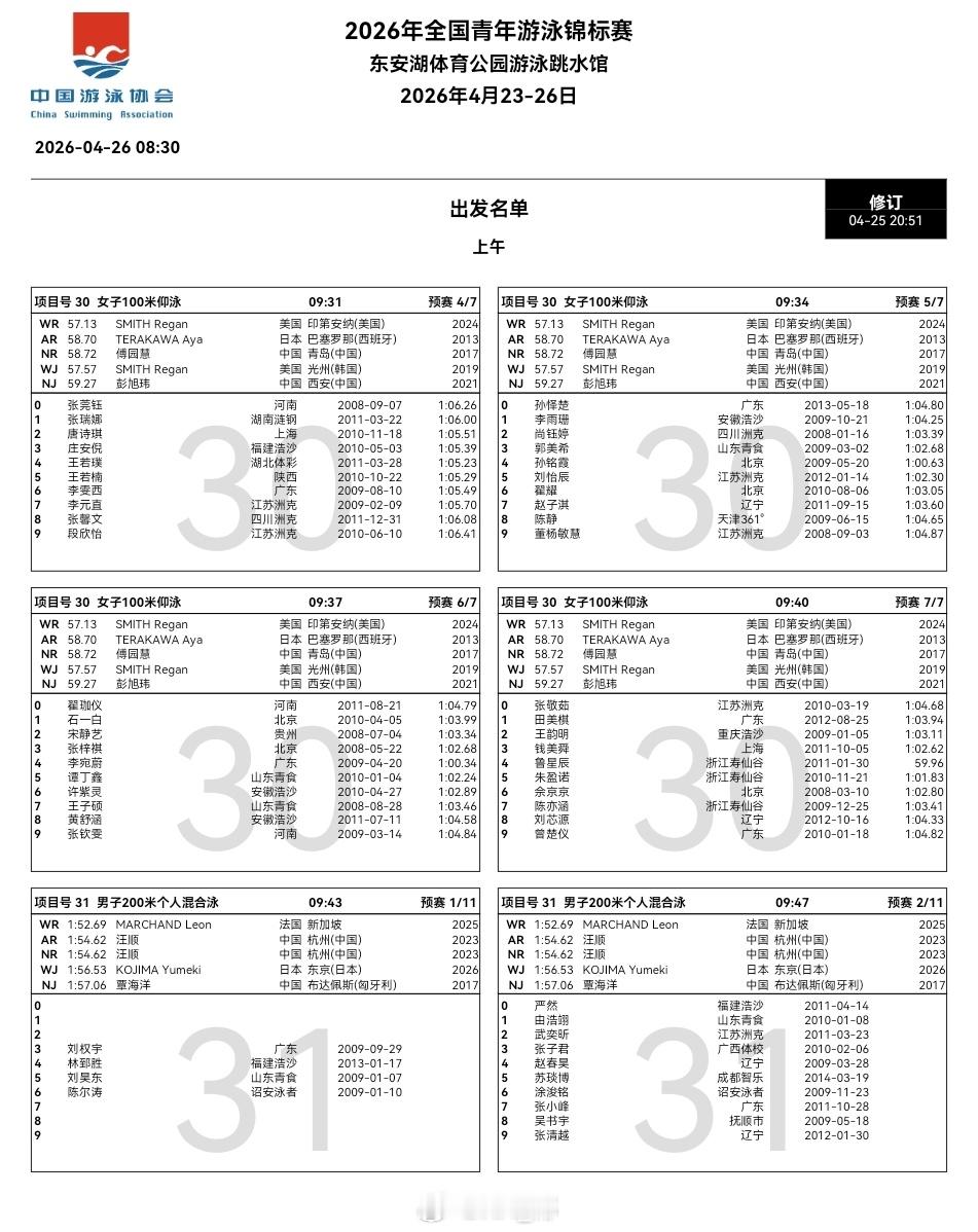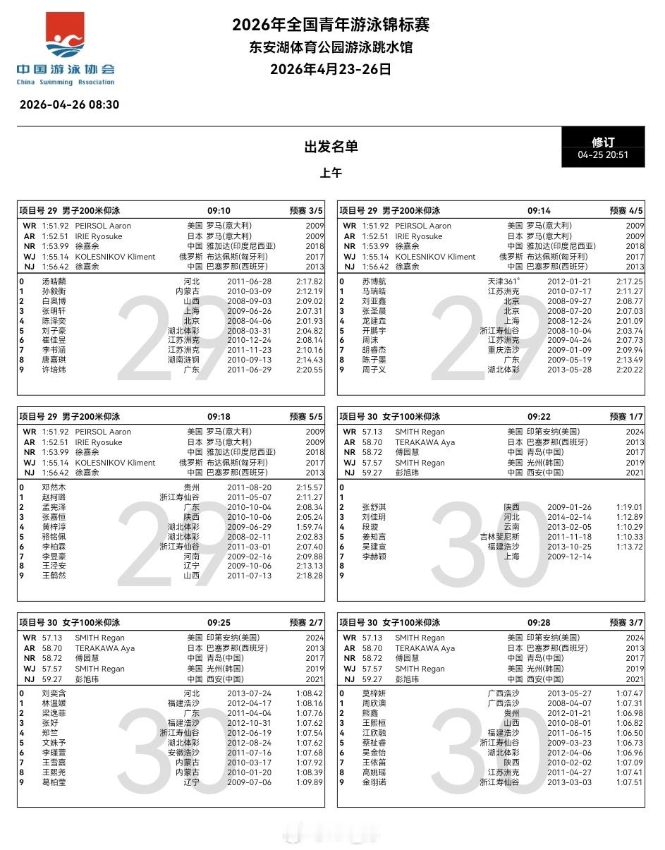 全国青年游泳锦标赛 最后一天预赛秩序单