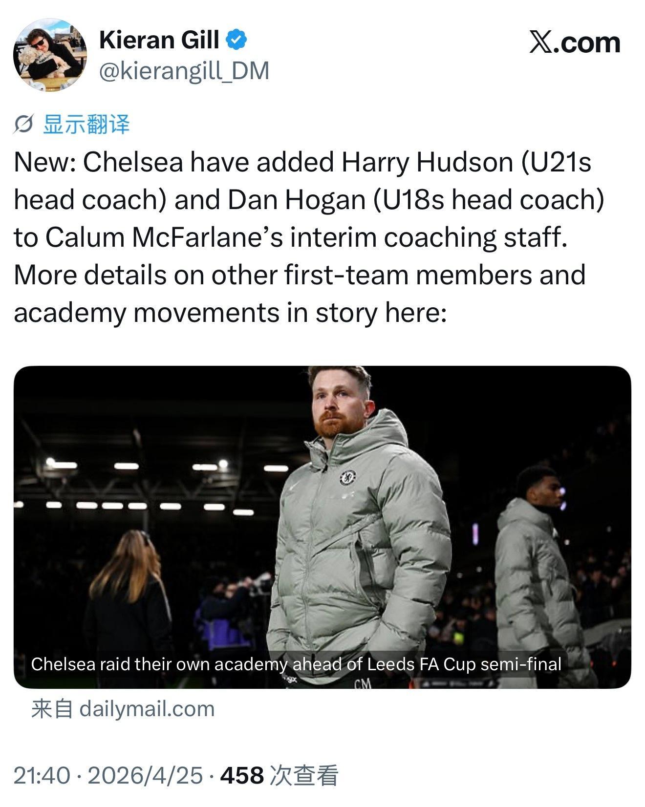 切尔西已将哈里·哈德森(U21队主教练)和丹·霍根(U18队主教练)加入麦克法兰的临时教练组。