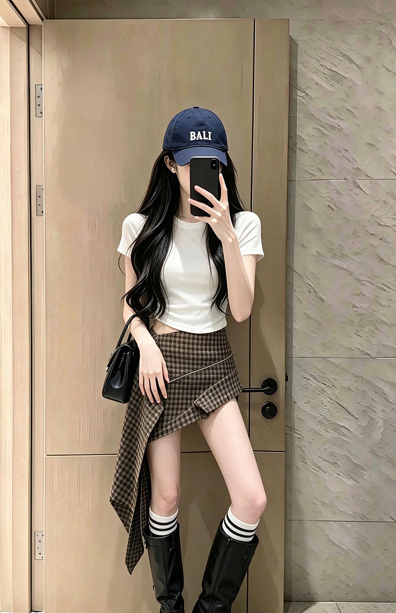 元气少女穿搭指南白色短T+格子短裙+黑色长靴活力满满