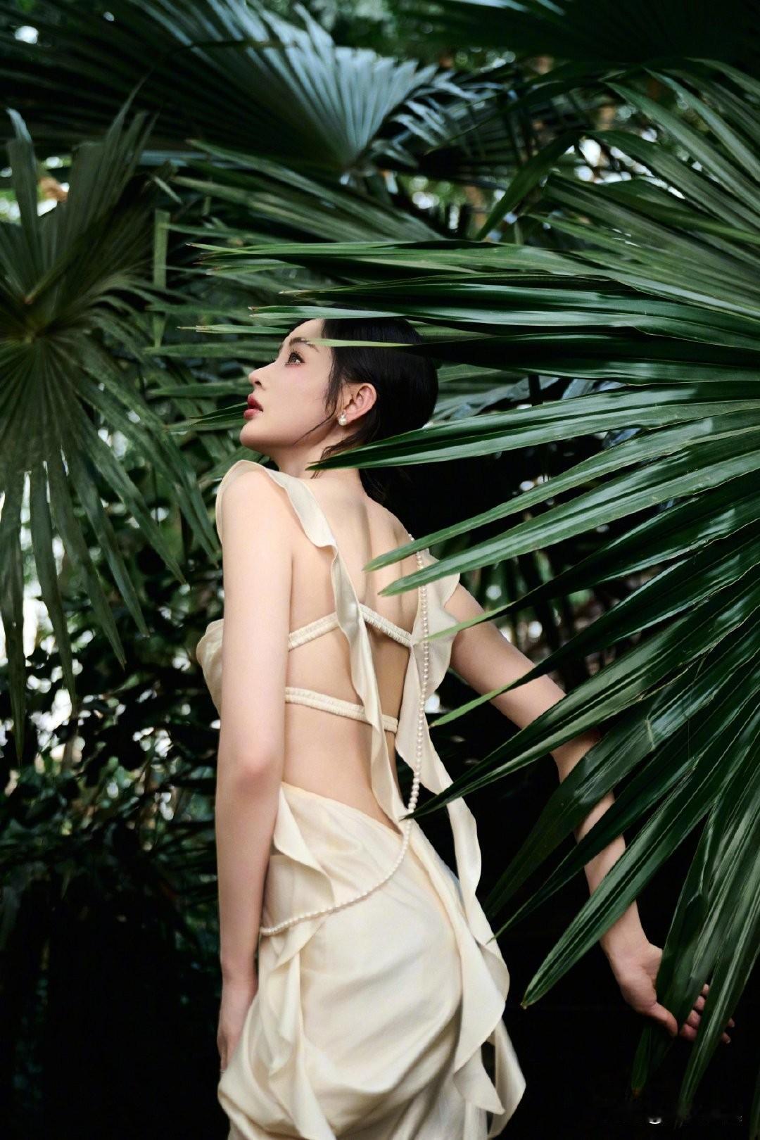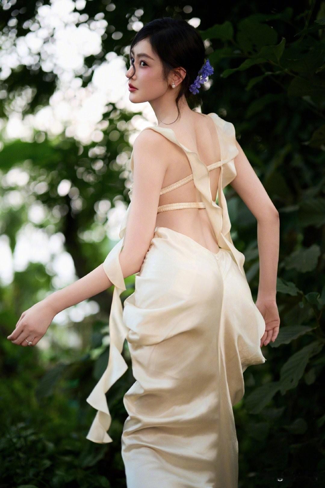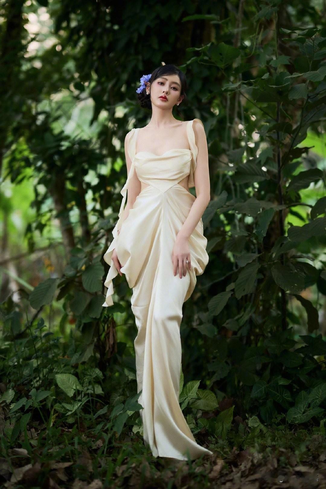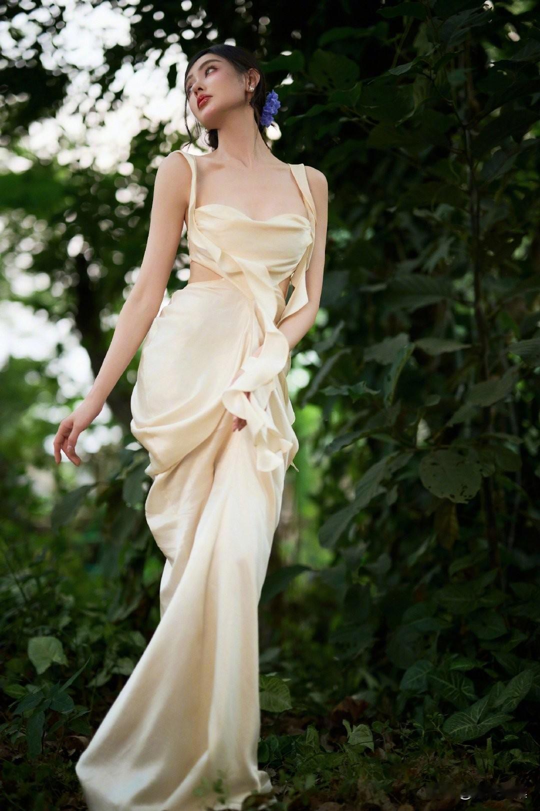 一袭香槟色缎面吊带长裙,置身热带雨林,绿意环绕,柔光洒落。抹胸+腰部镂空设计,褶皱缠绕剪裁灵动,垂坠裙摆拉长线条,勾勒曼妙曲线。耳畔点缀紫色花饰,与绿意温柔撞色,冷艳妆容搭配舒展身姿,兼具野性疏离与温柔仙气,松弛又高级。
