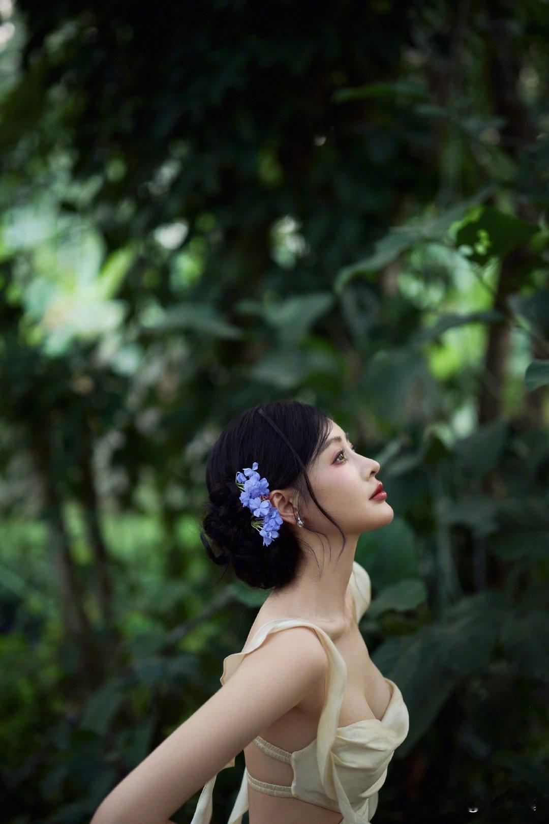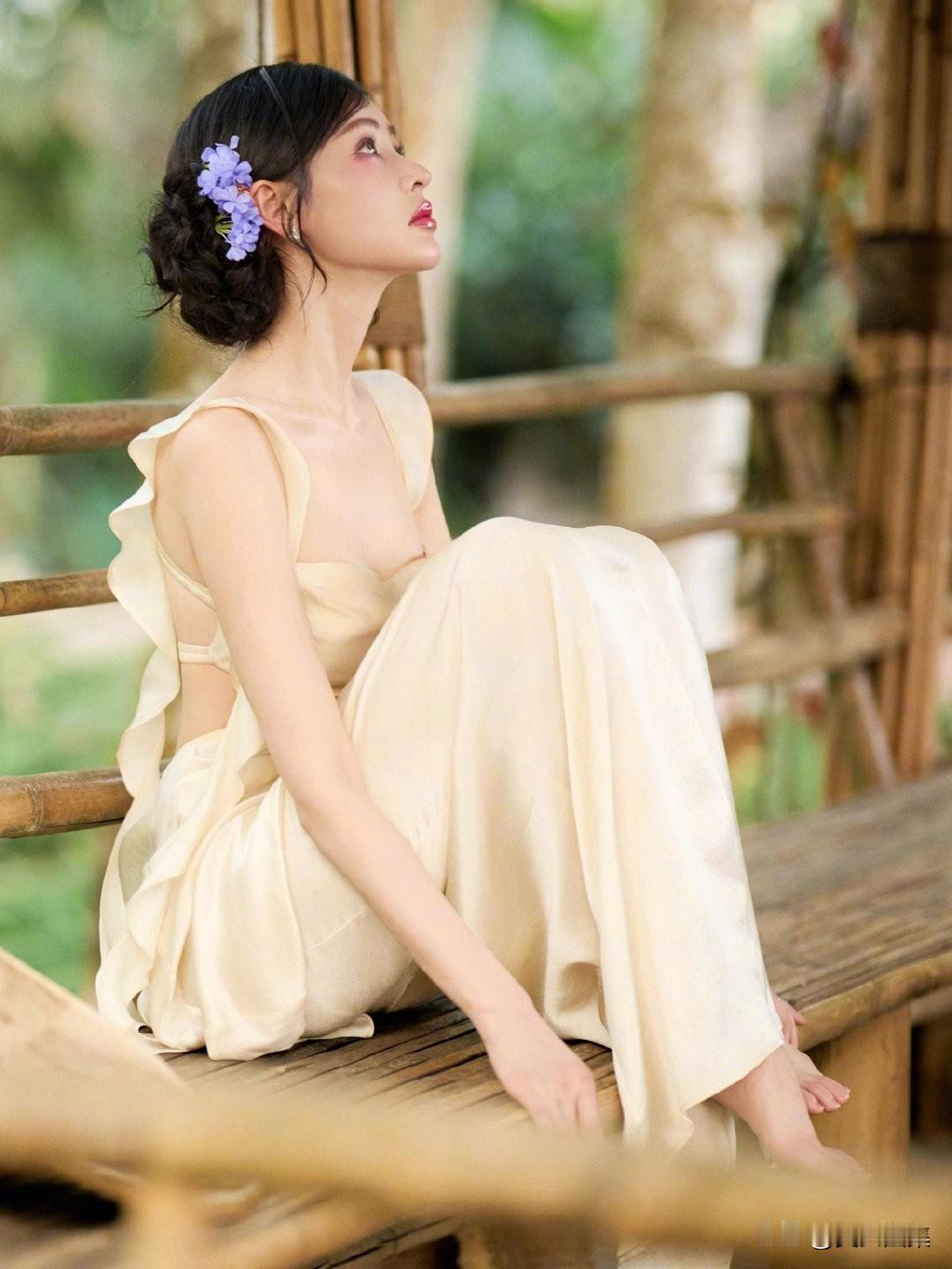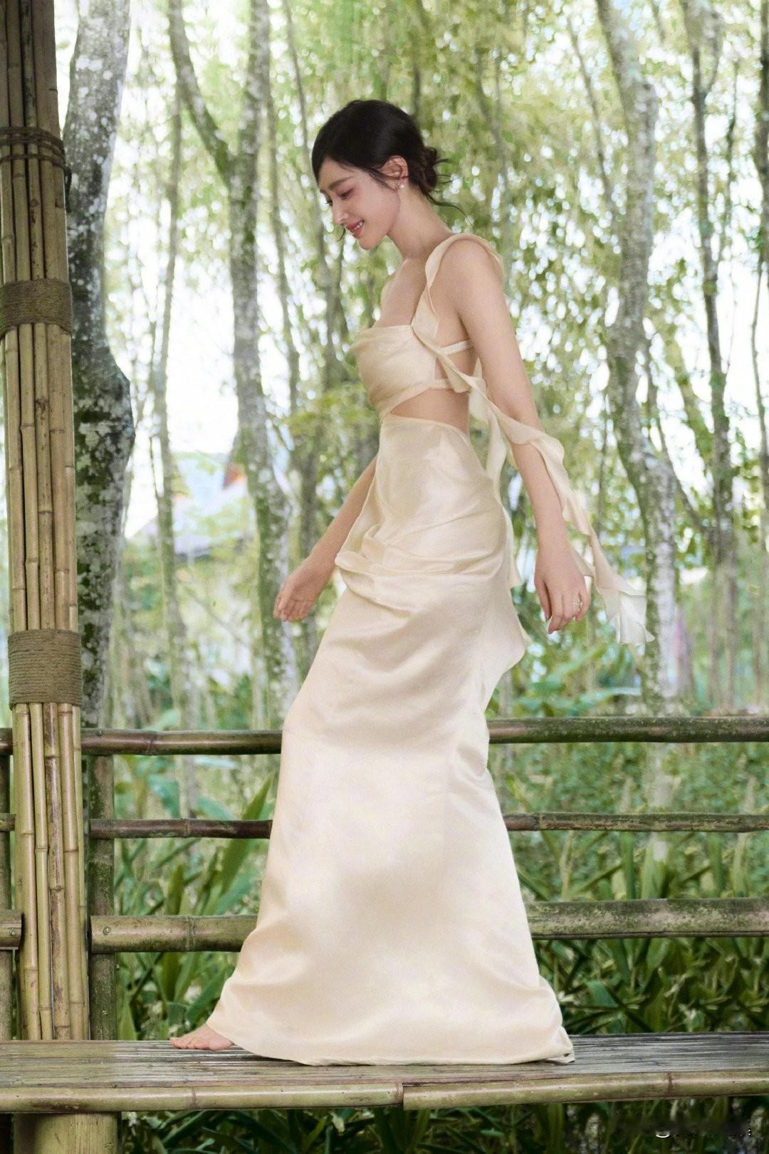 一袭香槟色缎面吊带长裙,置身热带雨林,绿意环绕,柔光洒落。抹胸+腰部镂空设计,褶皱缠绕剪裁灵动,垂坠裙摆拉长线条,勾勒曼妙曲线。耳畔点缀紫色花饰,与绿意温柔撞色,冷艳妆容搭配舒展身姿,兼具野性疏离与温柔仙气,松弛又高级。