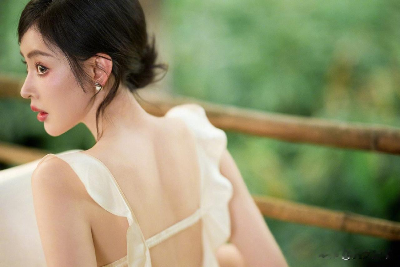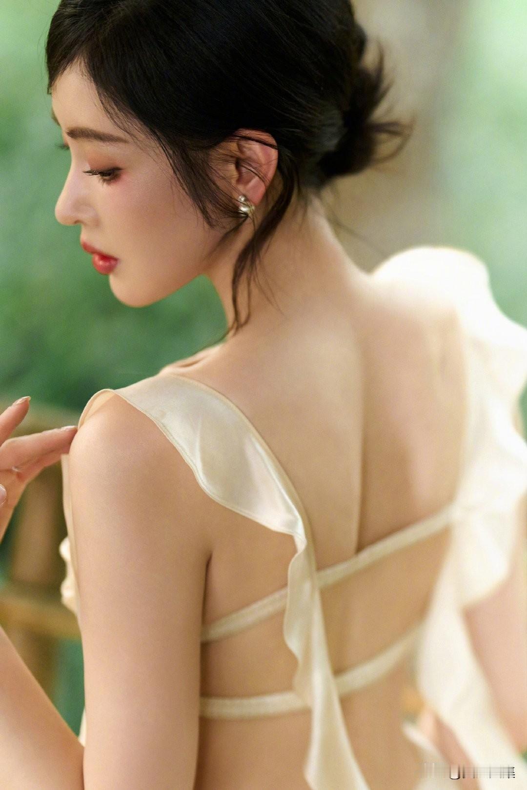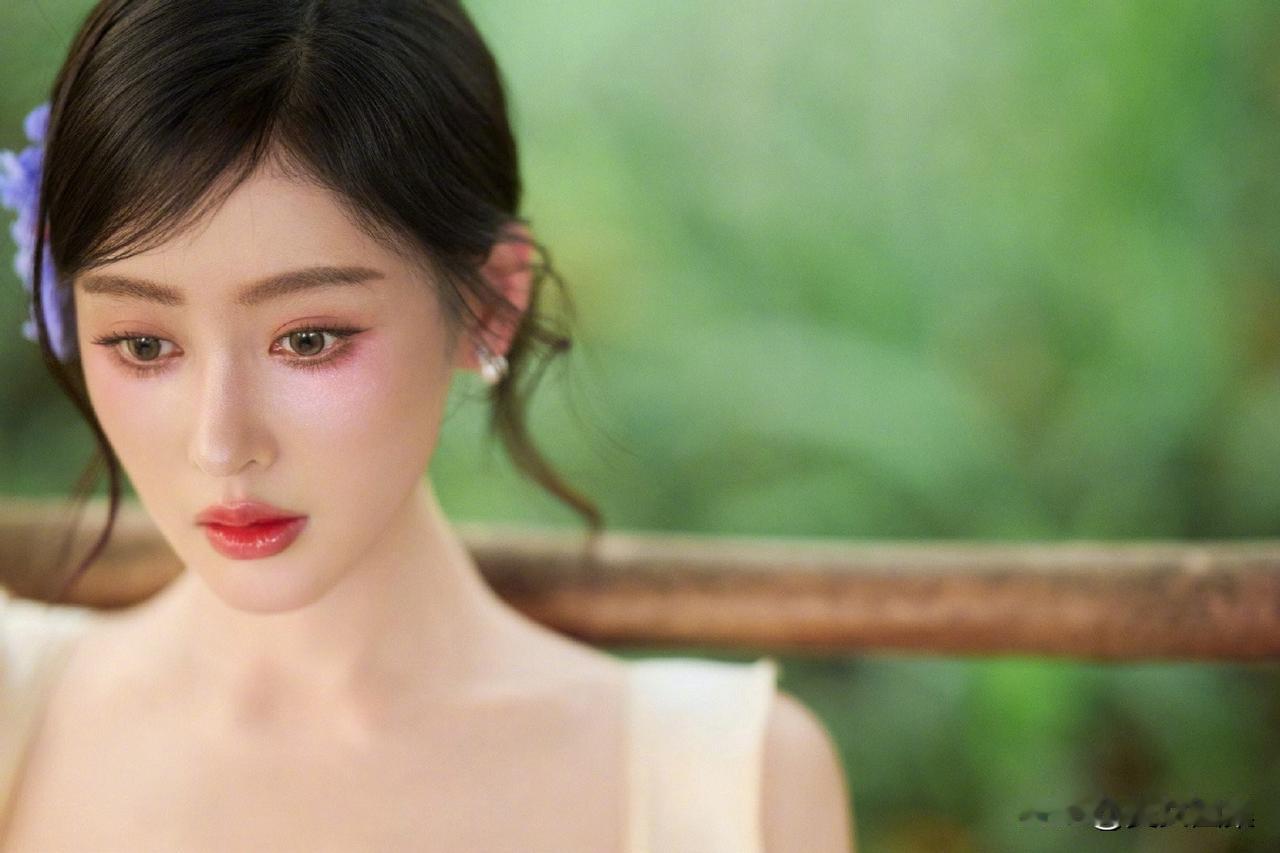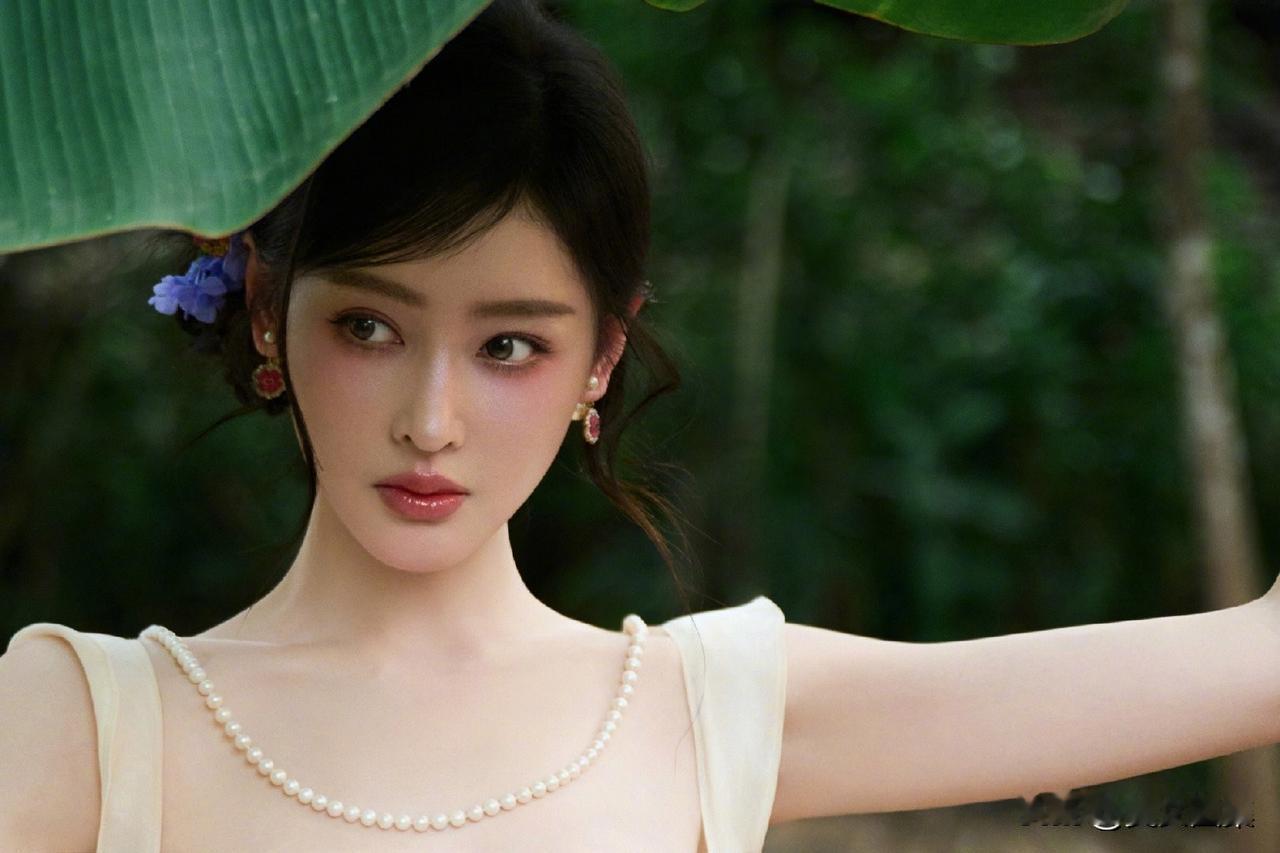 一袭香槟色缎面吊带长裙,置身热带雨林,绿意环绕,柔光洒落。抹胸+腰部镂空设计,褶皱缠绕剪裁灵动,垂坠裙摆拉长线条,勾勒曼妙曲线。耳畔点缀紫色花饰,与绿意温柔撞色,冷艳妆容搭配舒展身姿,兼具野性疏离与温柔仙气,松弛又高级。