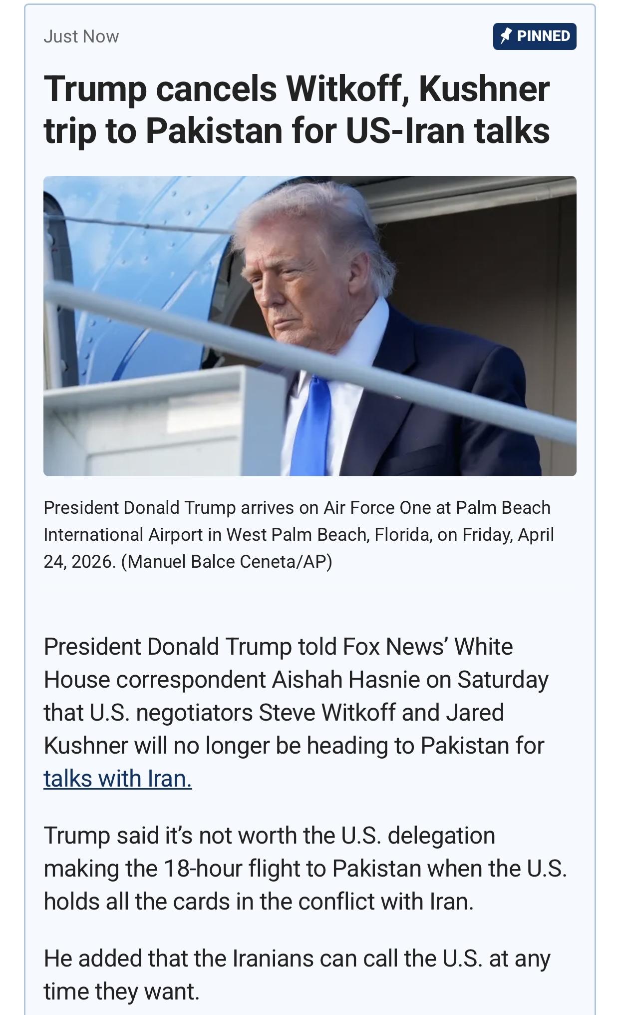 美国福克斯新闻(Fox News)官网4月26日报道:周六,特朗普总统告诉福克斯新闻频道报道白宫新闻的记者艾莎·哈斯尼,美国谈判代表史蒂夫·维特科夫和贾里德·库什纳不再前往巴基斯坦与伊朗进行谈判。
