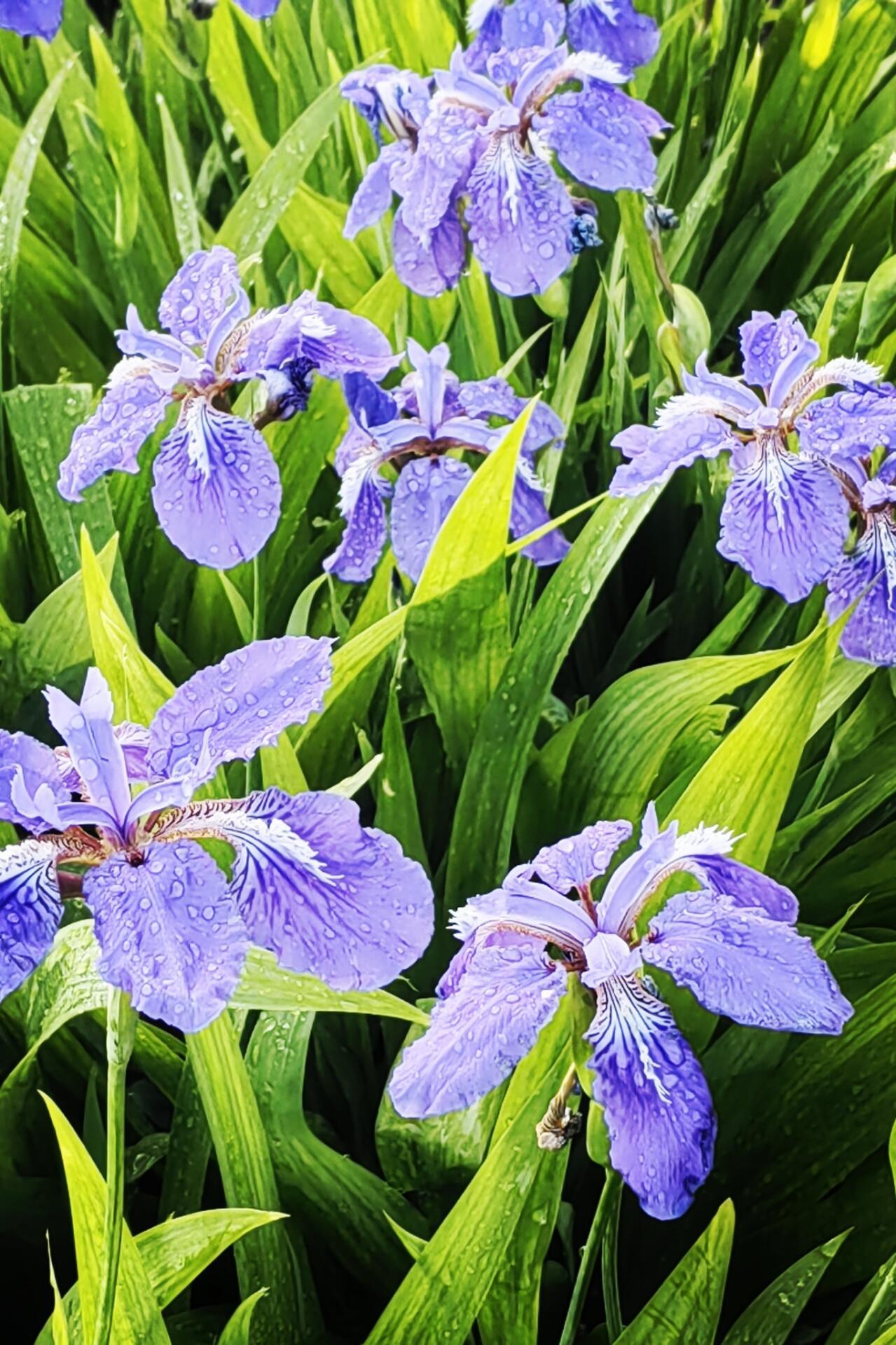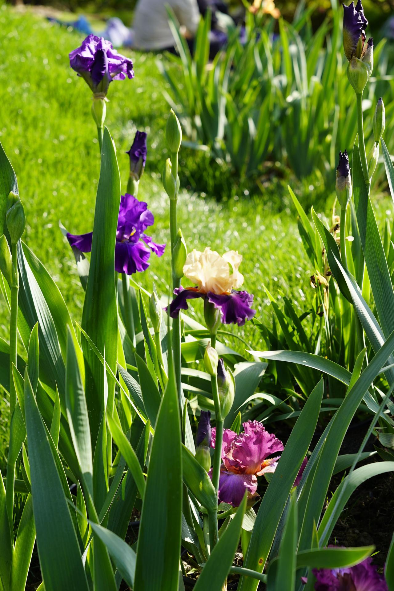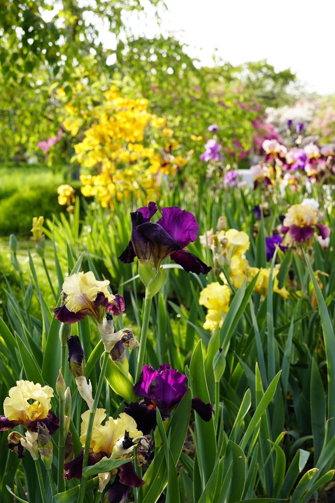 沿着水岸漫步,鸢尾花的品种不止一种。有色彩最为丰富的德国鸢尾,白色、蓝色、紫色、紫红色、黄色和复合色应有尽有;有几乎全为蓝色调的西伯利亚鸢尾,花形纤细雅致;还有黄鸢尾,通体金黄,在蓝紫色的花丛中格外抢眼。在园艺学上,鸢尾属植物根据花被基部有无须毛,可分为有髯鸢尾和无髯鸢尾两大类别,前者以德国鸢尾为代表,后者则包括日本鸢尾和西伯利亚鸢尾等。