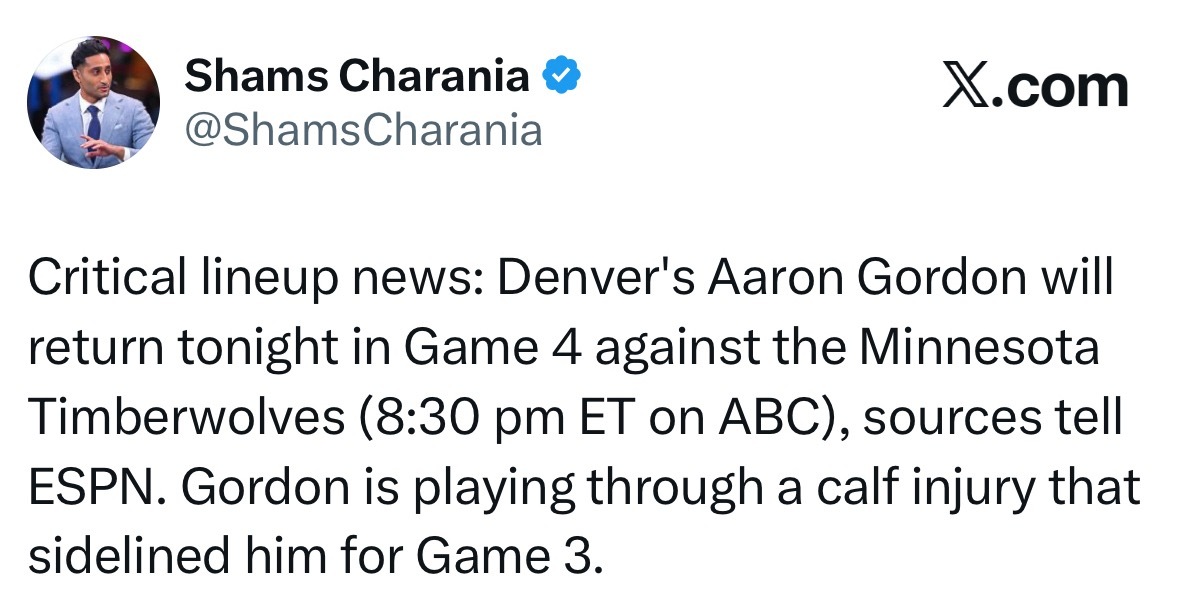 吕布!Shams:戈登今日带伤出战! 阿隆-戈登今晚G4对阵明尼苏达森林狼一战正