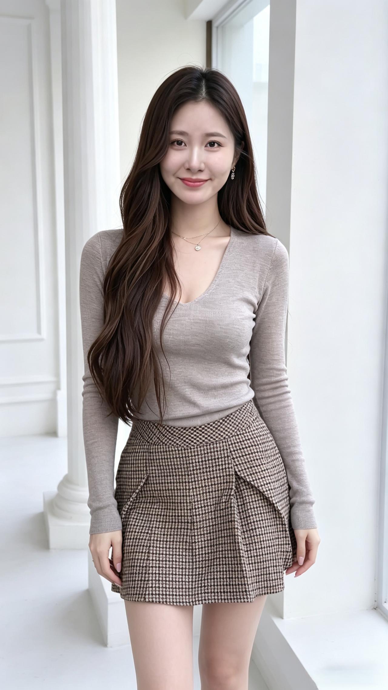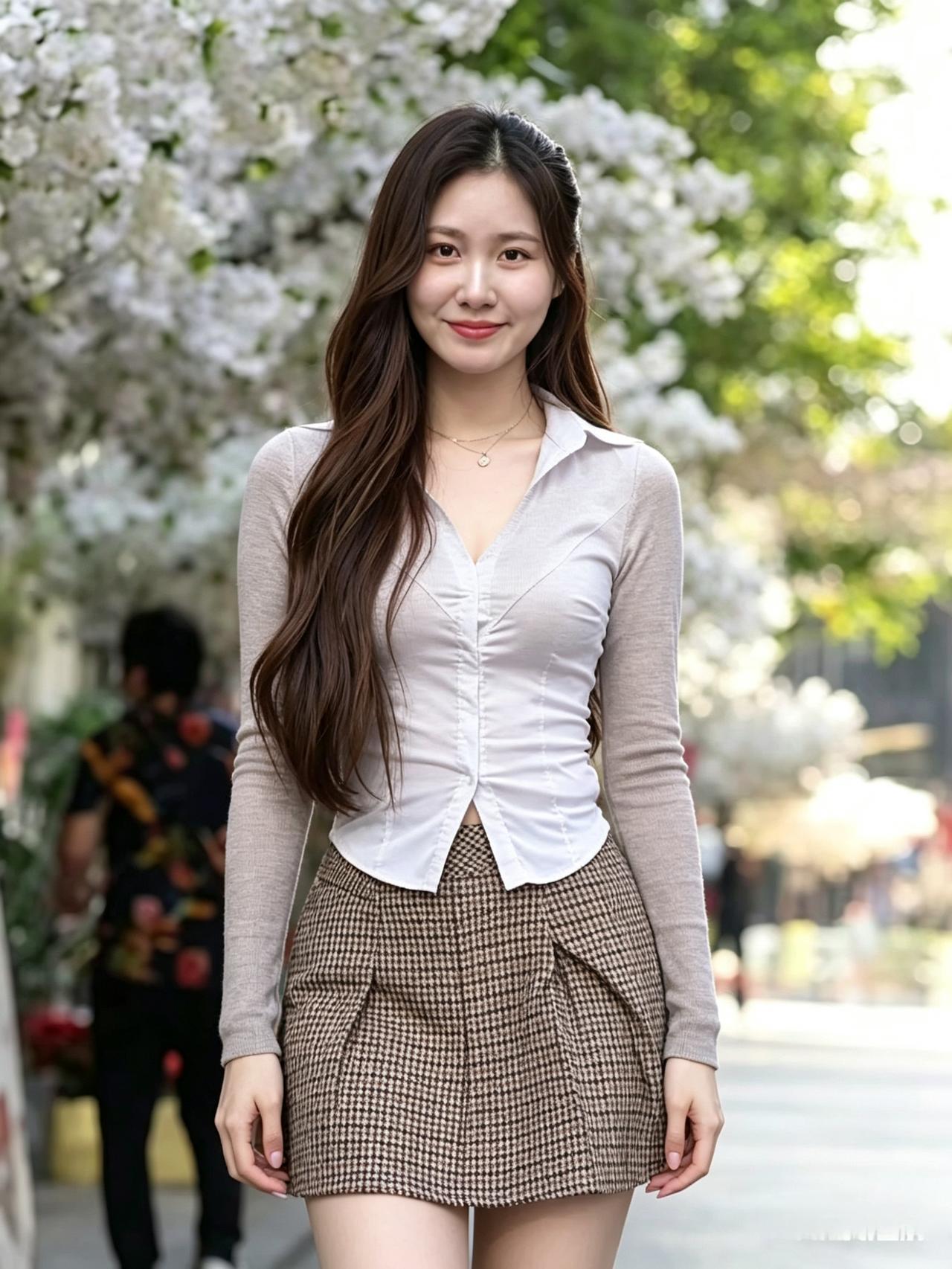 长发如云衬玉容,浅衫低领自从容。 庭前花下亭亭立,一室清辉为彼浓。 眉眼含春春不