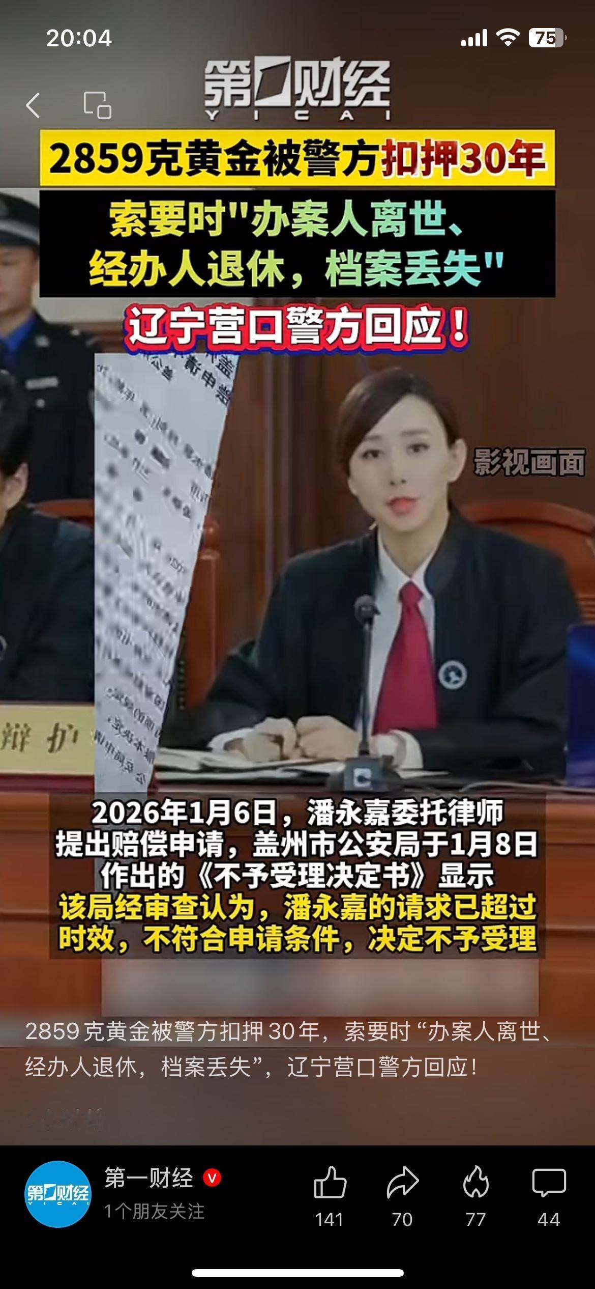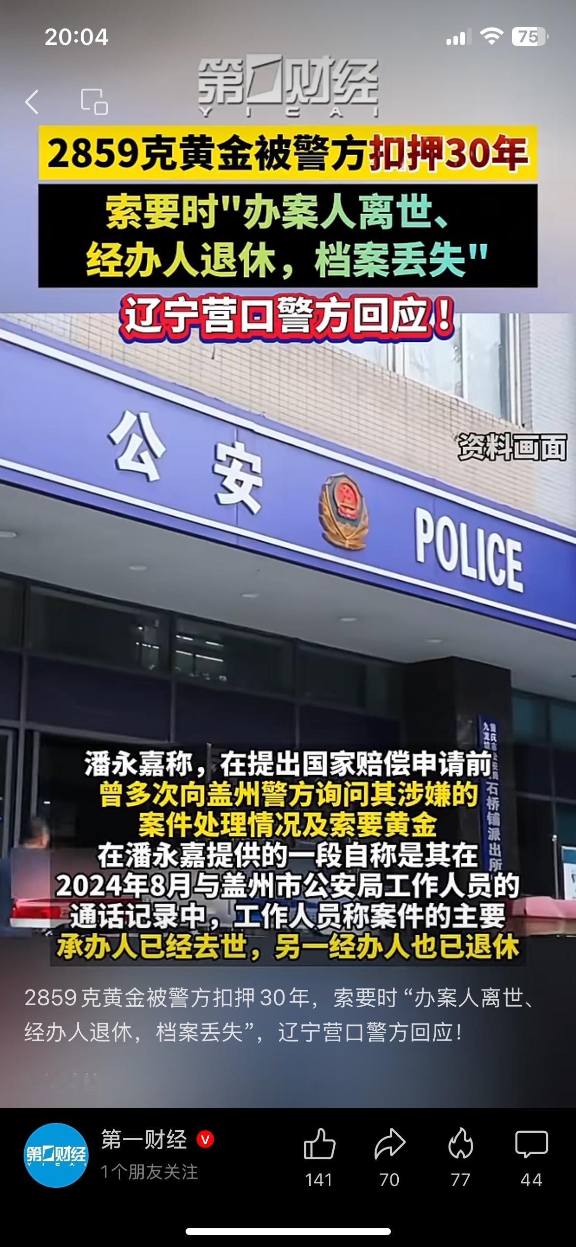 2859克黄金被警方扣押30年,现在当事人索要时,办案人离世、经办人退休、档案还丢了。 营口警方回应正在研究,尽快给答复。 30年过去,连档案都没了,当事人维权有多难可想而知。 你觉得这事该怎么解决? 黄金扣押 维权