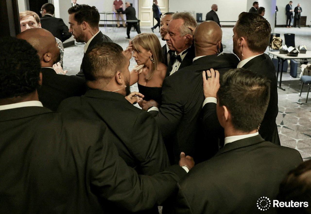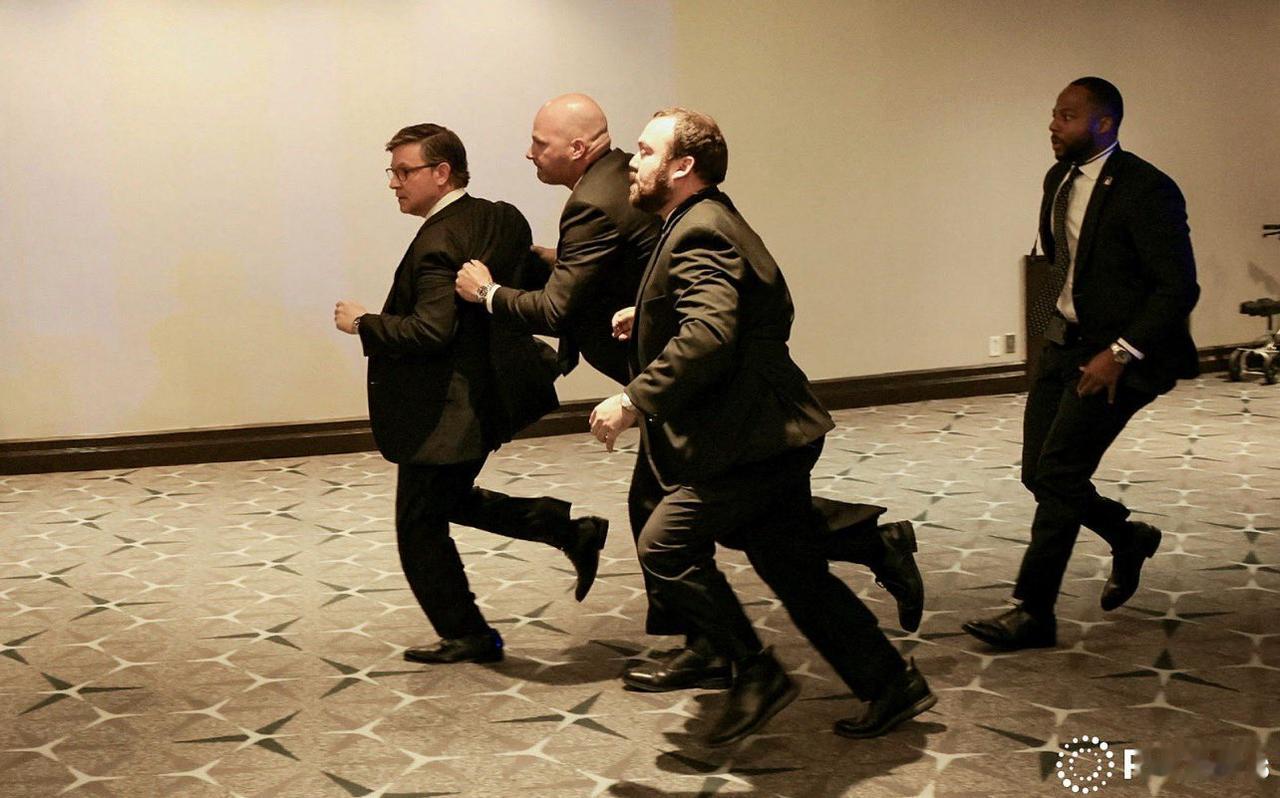 照片显示,美国卫生与公众服务部部长小罗伯特·肯尼迪及其妻子谢丽尔·海因斯(图七),以及众议长约翰逊等人(图八),纷纷被特勤团团围住,或紧急带往安全地点。