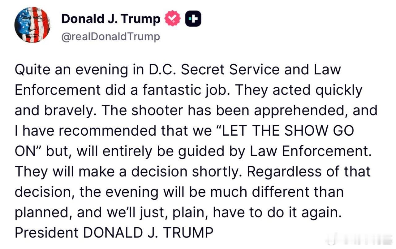 特朗普表示今晚在特区的经历令人难忘,特勤局和执法部门表现出色,枪手已被抓获,第一夫人、副总统以及所有内阁成员目前状况良好。他将在白宫新闻发布厅举行新闻发布会向大家通报情况。来源:realDonaldTrump特朗普因安全原因离开白宫晚宴白宫晚宴枪击事件枪手身亡美国白宫记者晚宴传出枪声
