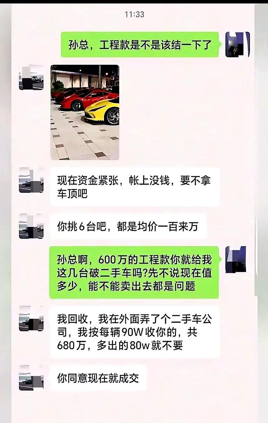 工地干完活儿甲方没钱给,张口就拿六台百万超跑抵600万工程款,还打包说自己有二手车公司每台90万回收,算下来能给你680万,多出来的钱都不用退!