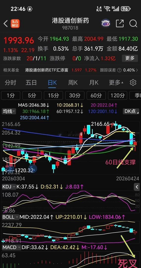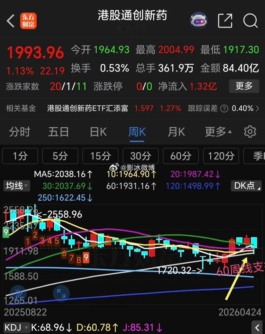 港股通创新药 恒生科技下周走势分析。恒生科技指数前面反弹力度比较弱,连60日线压力位都没有触及就开始回调,目前已经跌破了多条均线支撑,下周5日线开始死叉10日线,周五回补了部分缺口,由于周五美科技板块全面反弹,下周一恒生科技指数有可能高开,如能高开高走,化解5日线死叉10日线趋势,否则,高开低走,就要回补下方缺口,然后继续探底。从它的月线走势来看,月线也是处于下跌趋势,连续下跌6个月了,目前30月线占时获得支撑,假如失守30月线支撑,后期将继续探底,甚至会复制2018年行情(方框内走势),但愿不会这样走,否则26年都没有好日子过。 港股通创新药,港股通创新药表现也是不及预期,反弹到压力区域就回头下跌,已经连续下跌一周。本周五守住了60日线支撑,但是,5日线已经死叉10日线,macd刚刚死叉,短线回调没有结束。假如在60日线支撑止跌反弹,有可能继续挑战前面高点,否则会继续下探。 港股通创新药已经跌破了5 周线支撑,但是守住了60周线支撑,大趋势还没有破坏。不过这个位置不能再继续下跌,否则真的会回踩前面低点,空间有点大! 整个港市几大指数表现都比较弱,不放量拉升很难走出泥潭。