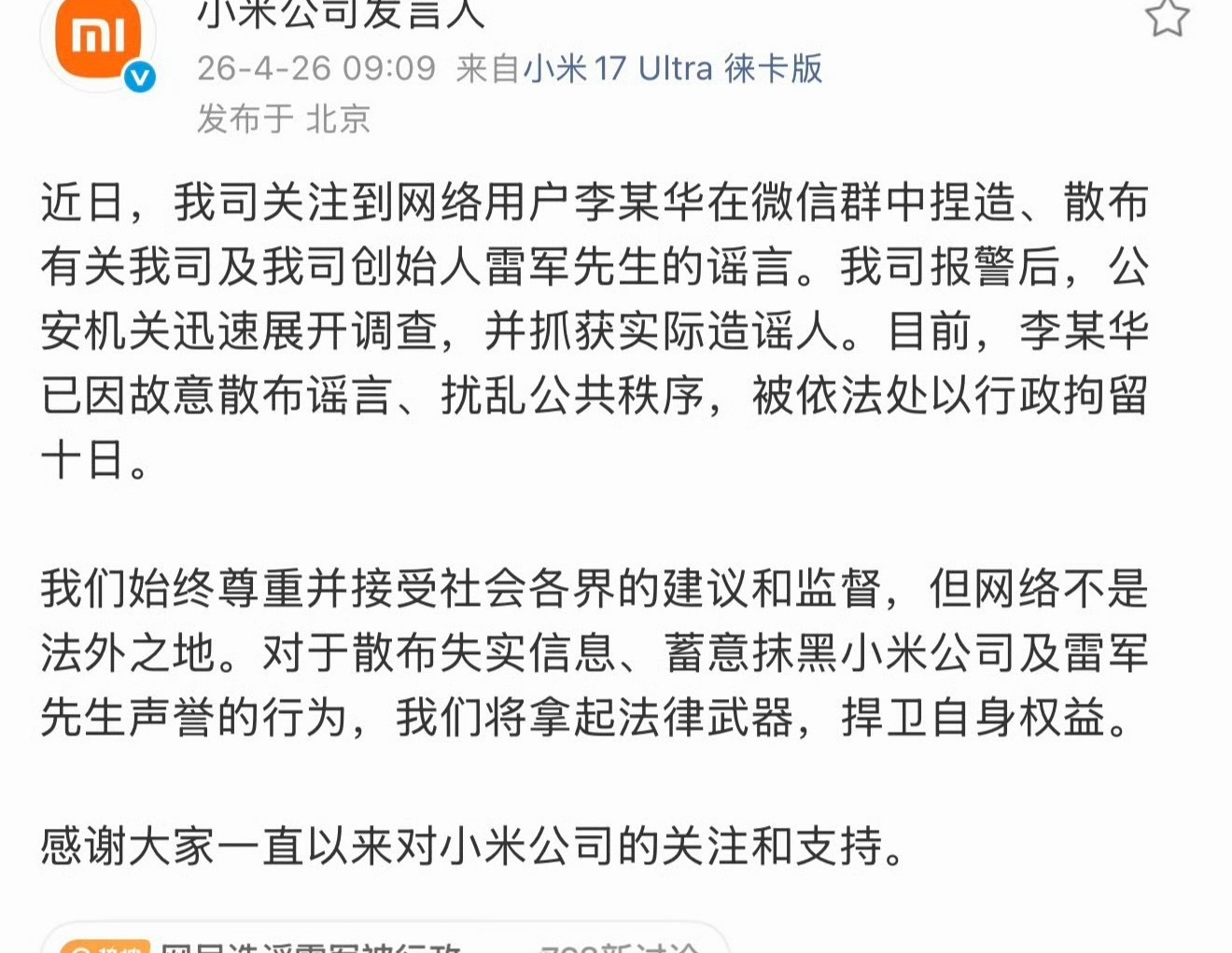 网民造谣雷军被行政拘留10天在互联网上你可以不喜欢任何人和任何品牌但是不能造谣、