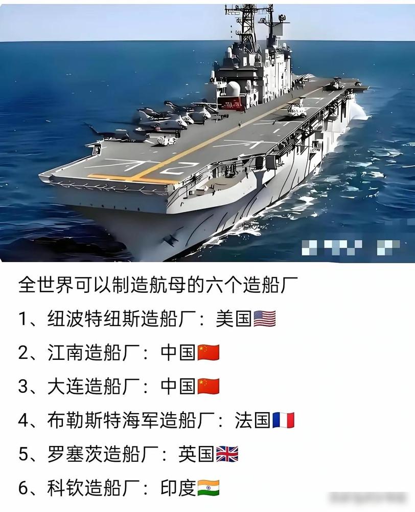 算下来全球目前总共也就6家具备航母建造能力的船厂,咱们的江南造船厂、大连造船厂就占了两席,剩下的分别是美国纽波特纽斯造船厂、法国布勒斯特海军造船厂、英国罗赛茨造船厂和印度科钦造船厂,刚好剩下的每个国家各占一家。