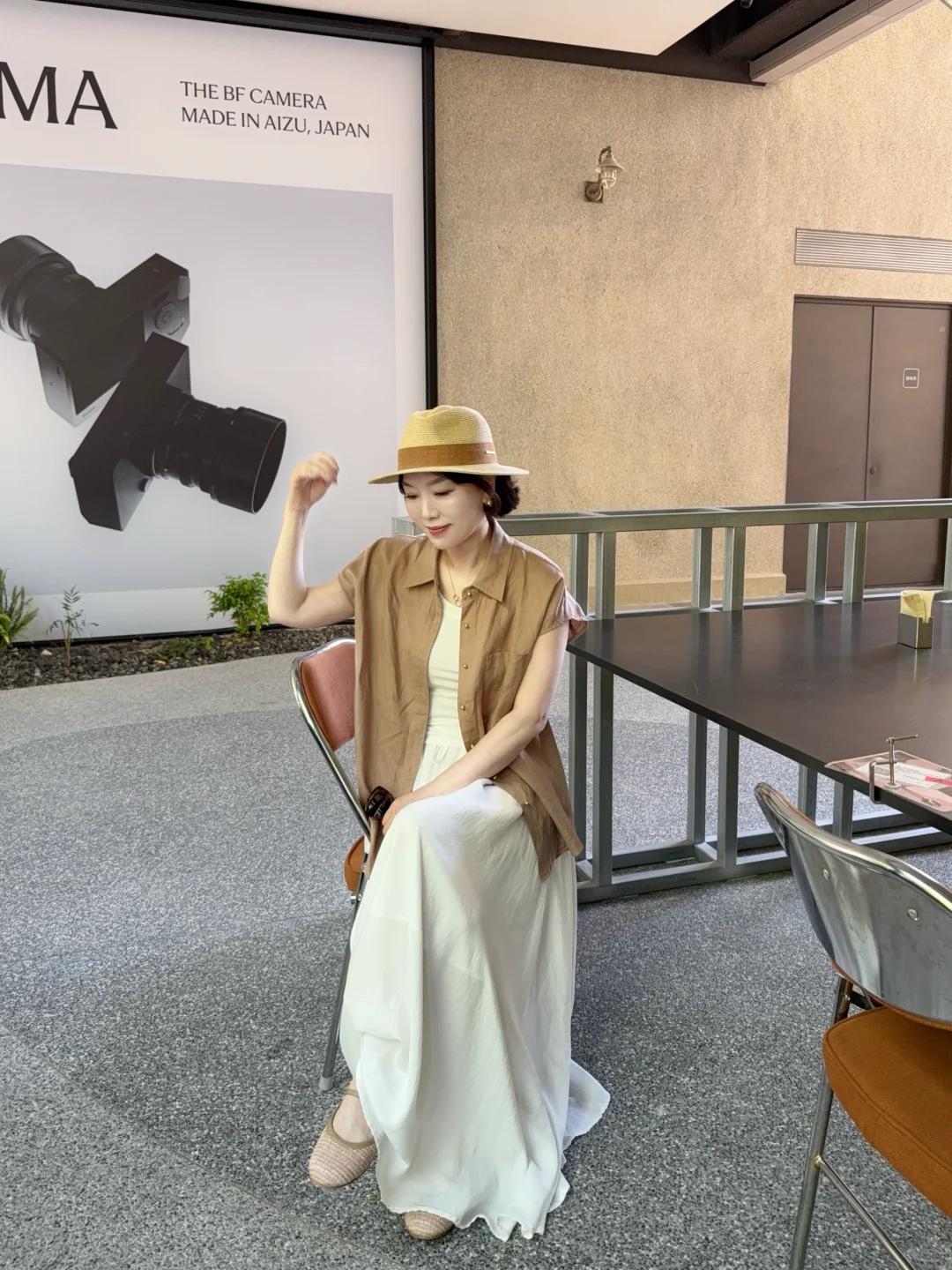 下半身搭配纯白色半身裙,柔和的版型修饰身形,利落又温婉,中和了咖色的沉稳,整体清爽干净,温柔氛围感直接拉满。随手搭配灰色包包+编织帽,质感相辅相成,满满的夏日慵懒氛围感。