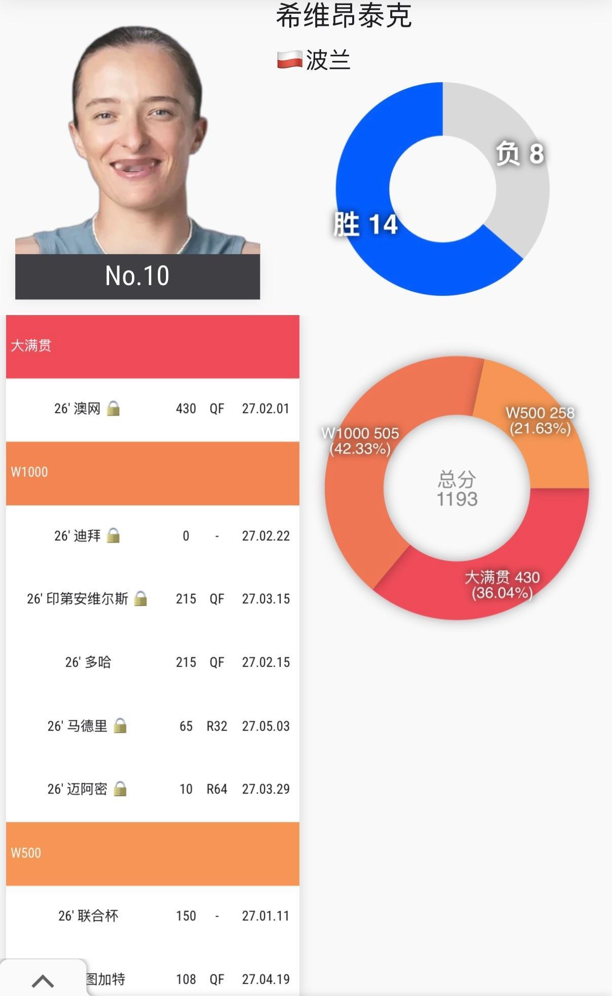 她今年到目前为止最好成绩居然只有八强,对于曾经一枝独秀的她来说真的很低谷……主要她的成绩不好不是因为伤病导致的状态和能力的下降……今年输的8场比赛,其中7场是三盘输球,体能也成为了她的一大难题……网球