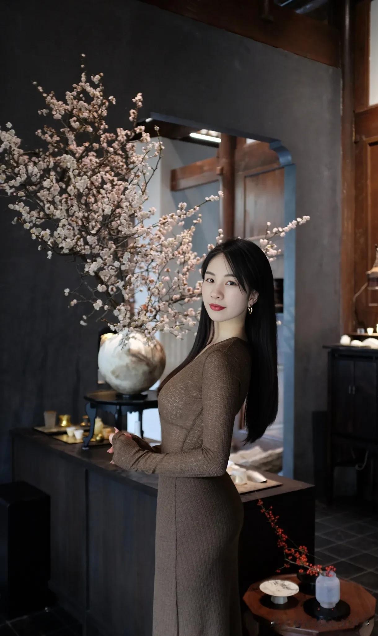 一进门就被这枝开得饱满的花吸引,素色的花簇配着深灰的墙面,随手站着拍一张都有温柔的氛围感。身边都是沉静的木质调,桌上摆着整整齐齐的茶器,连空气里的节奏都跟着慢了下来。