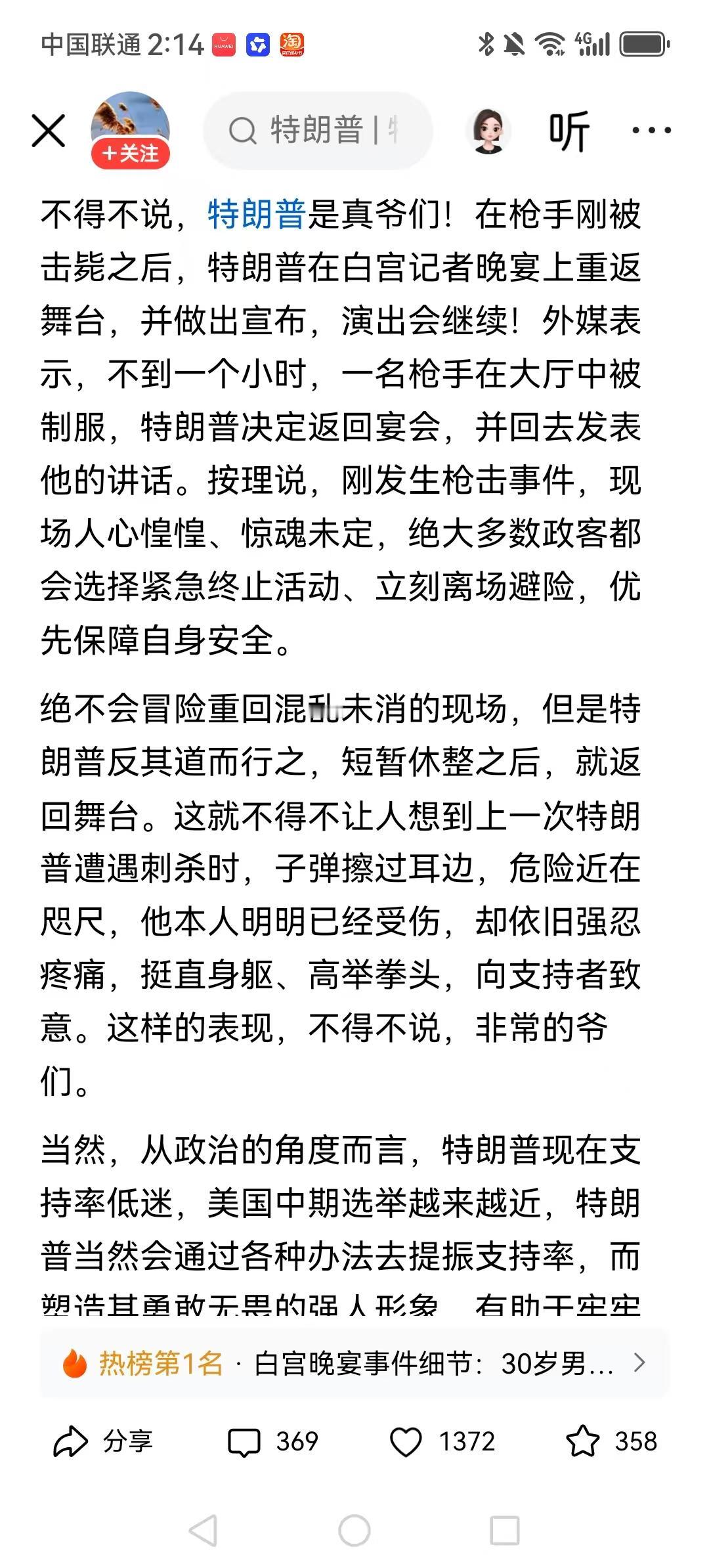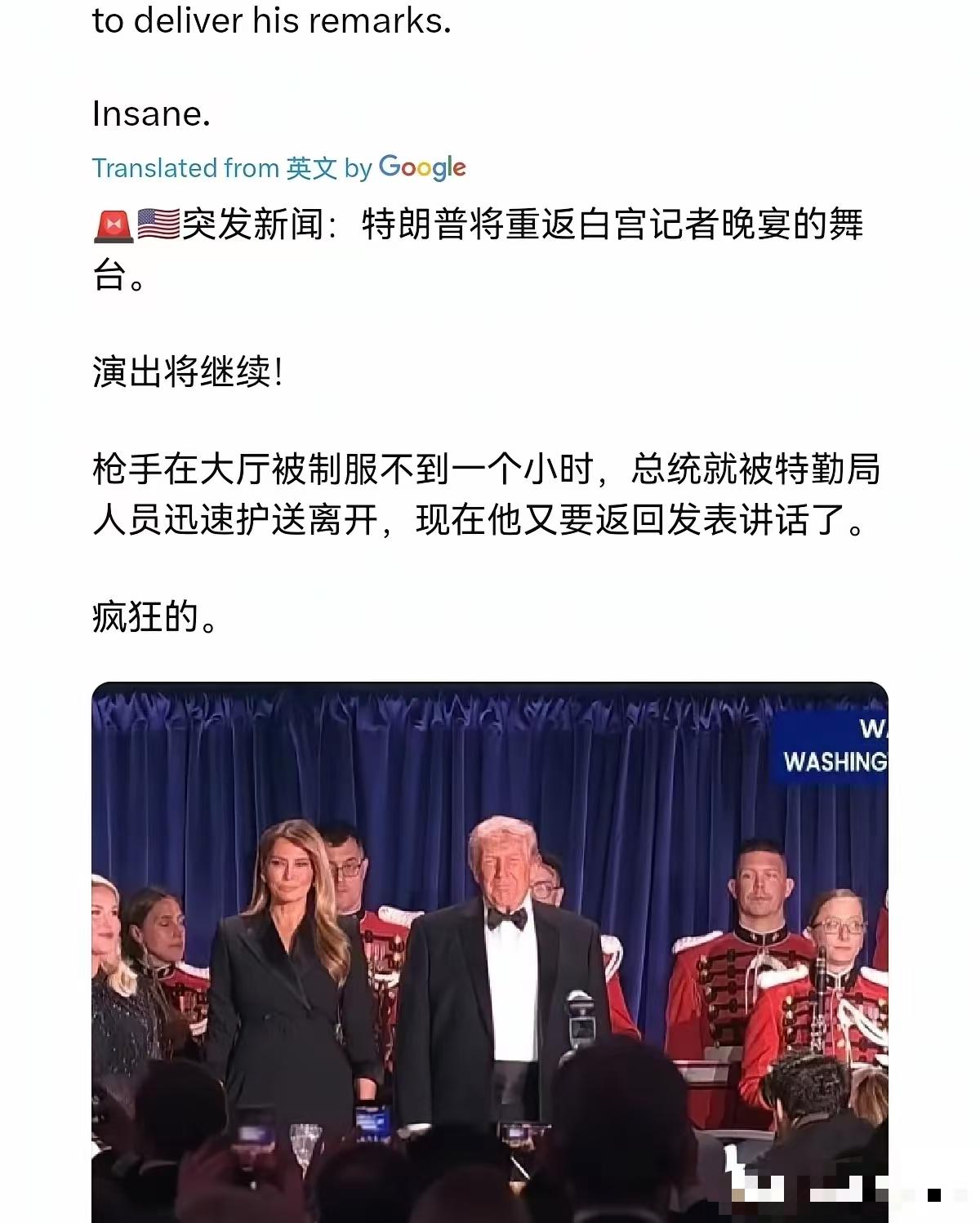 不得不说,特朗普是真牛。从他淡定重回舞台这一刻,而且白宫能带枪入,断定是自编自导的闹剧。