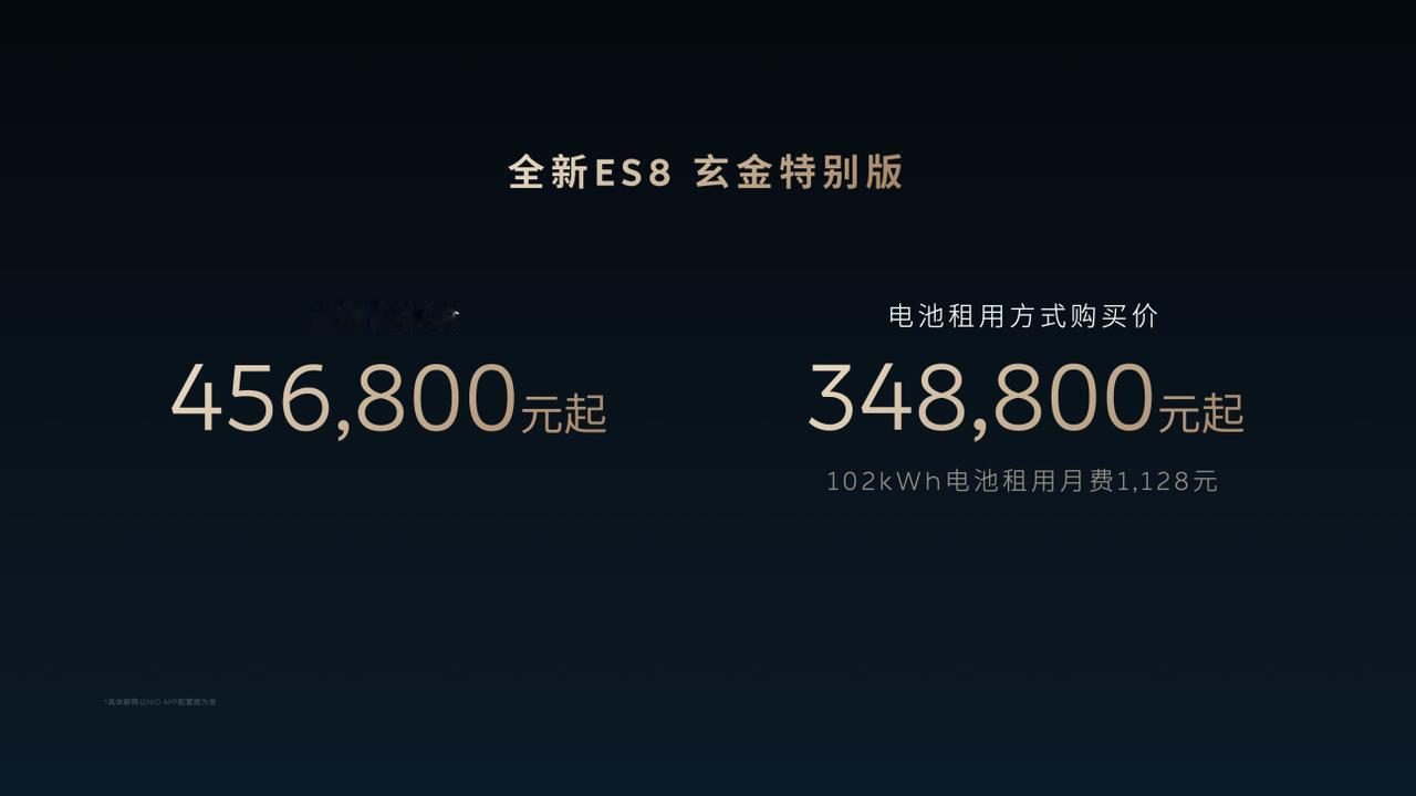 蔚来全新 ES8 玄金特别版北京车展发布,售价 456800 元,BaaS 电池租用价 348800 元;即日起至 4 月 30 日锁单,享限时购置税补贴 10000 元、五年 NOP + 免费使用权等权益,还有七年 84 期低息金融,BaaS 方案首付低至 59760 元起、月供 3144 元起。
