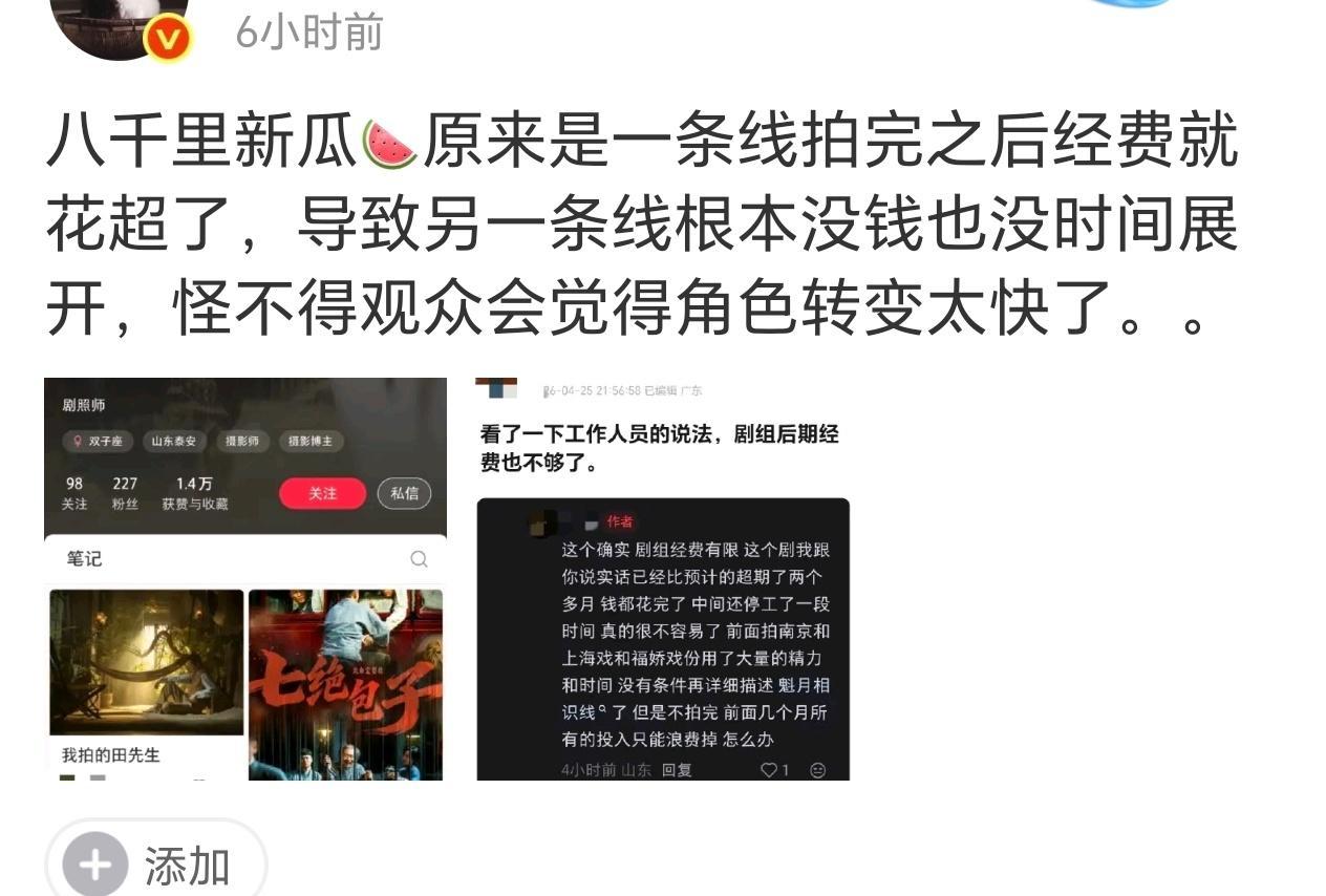 有工作人员爆料,说《八千里路云和月》一条路拍摄超出经费,导致另一条线没钱拍这部剧
