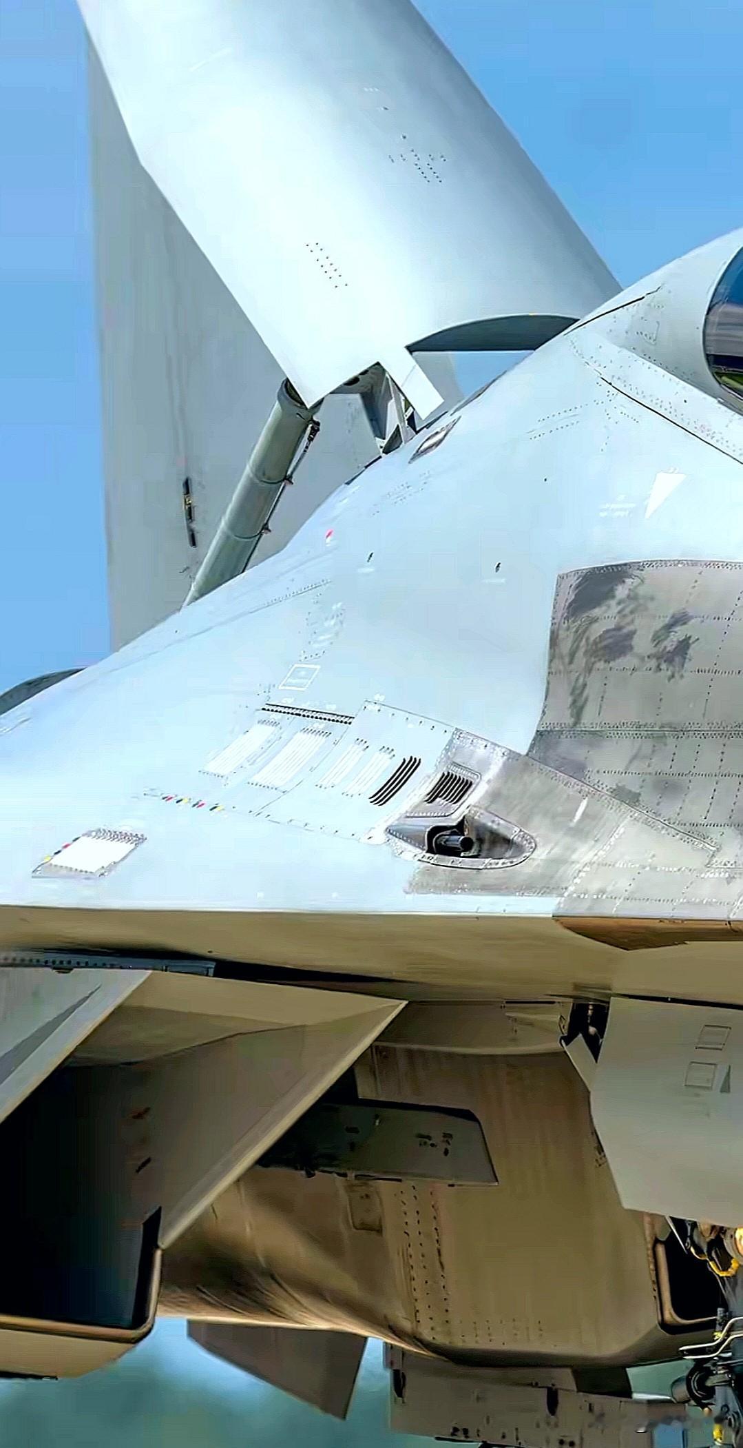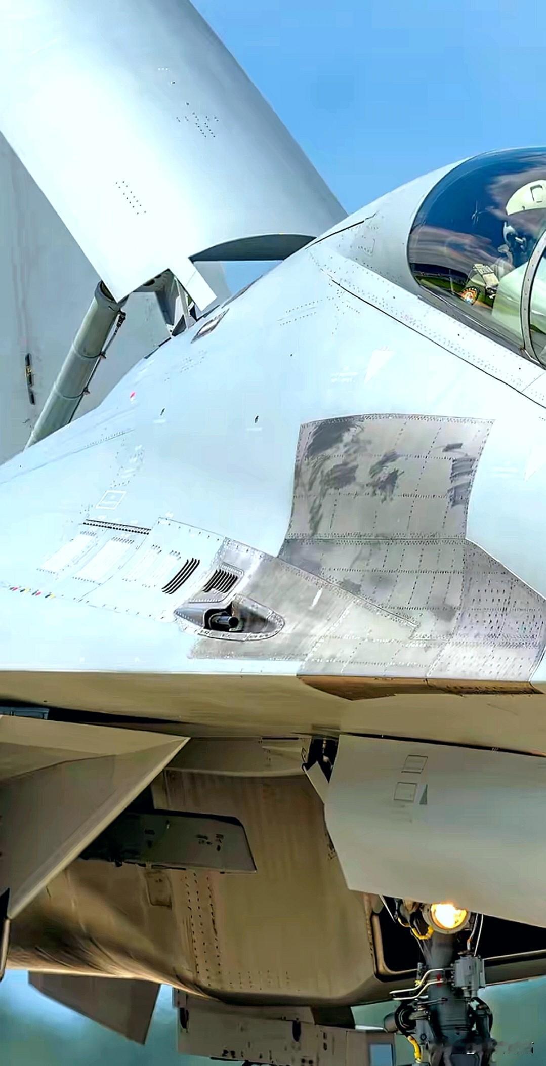 这门30毫米机炮开火之际,炮口火焰温度轻易就能超过上千摄氏度,普通的机身涂装会在瞬间被烧蚀、剥落。因此,此处直接采用了耐高温的钛合金/不锈钢蒙皮,且不做涂装处理,从而将高温与冲击隔绝在机身之外,保护后方的机身结构与航电设备。