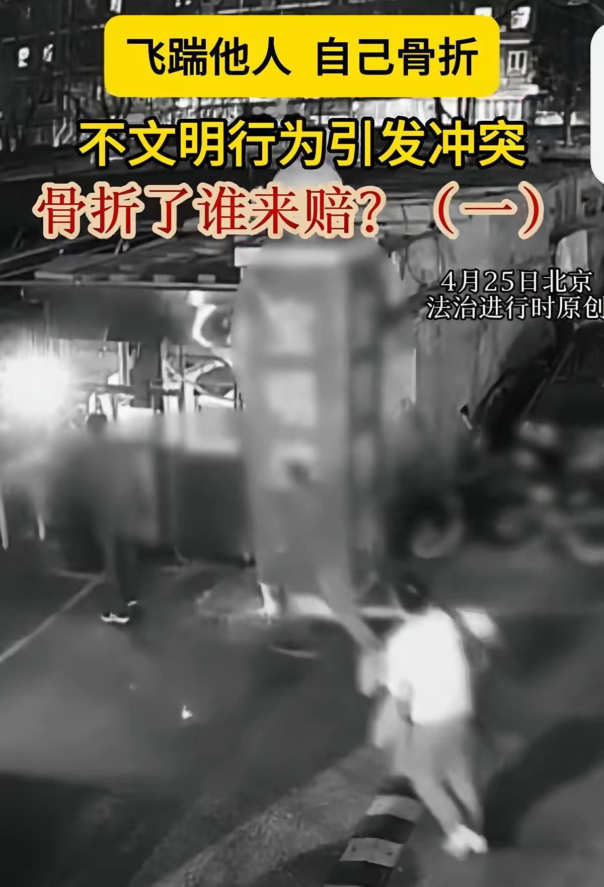 北京,男子酒后与朋友在停车场想开车离去,却突然尿急,就随便在一车边解决,被停车管理员发现劝他去公厕,谁知男子借着酒劲骂他多管闲事,管理员很生气说他又不是狗,随地大小便。这下激怒了男子,他疯狂地向前打他,被朋友拉住。管理员便扭头走开。男子挣脱朋友,助力起跳从身后飞踹那人,万没想到,没踹到那人,自己直接摔到地上造成腿骨折。4天后他报案,追究那人刑事责任,派出所未立案。随后他向检察机关投诉派出所,又追究停车场索要18万赔偿。法院:不是谁受伤谁有理,一分不赔!