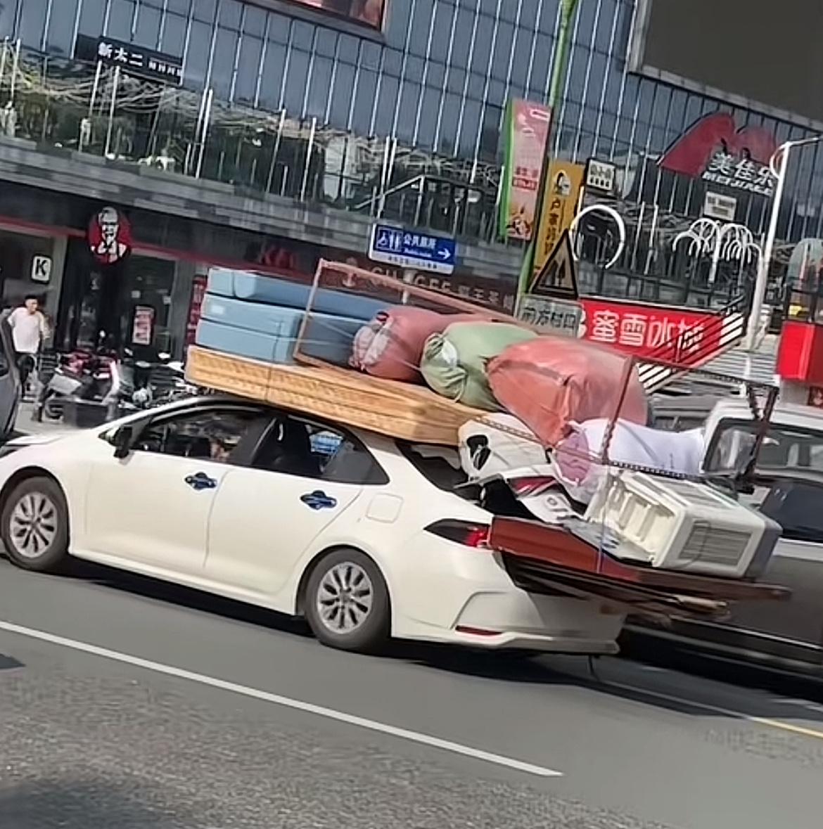看到的一个视频,广州那边边街头,有人看到这么一幕,一辆A级小轿车浑身拉满了家具,有床垫、沙发、好几个大包,甚至还有个洗衣机…