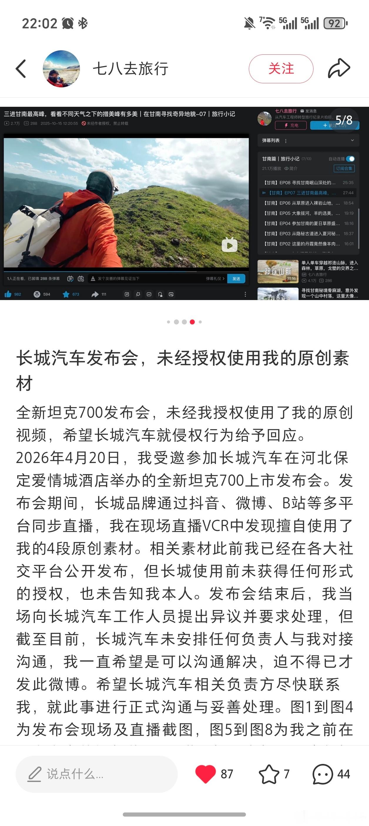 省流总结:博主“七八去旅行”说,长城汽车在2026年4月20日的坦克700发布会上,没经过他同意就用了他的4段原创视频。他现场提了,但长城一直没人理。现在他发帖喊话,要求长城赶紧对接处理侵权。