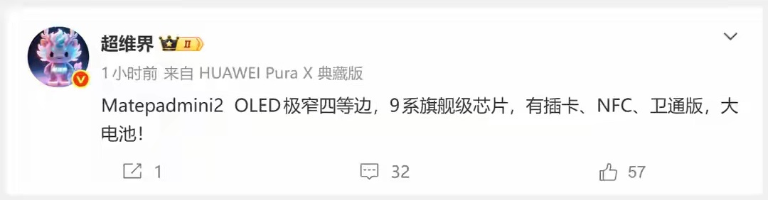 作为一代MatePad Mini的用户,看到二代的爆料,只能说一句:华为终于把用户的痛点都补上了!一代的轻薄、通话功能确实很香,但LCD屏的边框和性能上限,一直是遗憾。这次二代直接:OLED极窄屏,解决屏占比和色彩问题,麒麟9020旗舰芯,性能直接拉满, 保留5G插卡,还在加NFC和卫星通信。如果价格不飘,妥妥就是小平板里的“六边形战士”,坐等官方更多爆料!数码资讯