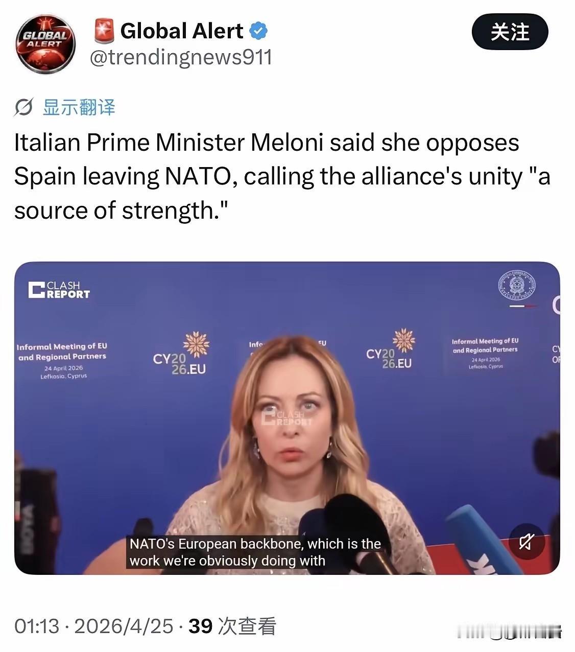 就在美国施压、不少欧洲国家沉默观望时,意大利总理梅洛尼在塞浦路斯欧盟峰会上,给出了最直接的回应。她公开表态:“我不认为西班牙离开北约是好事,西班牙是我们的力量,北约的团结就是我们的力量,必须维持这种团结。”这番话分量十足,等于直接跟美国的霸权思维对着干。