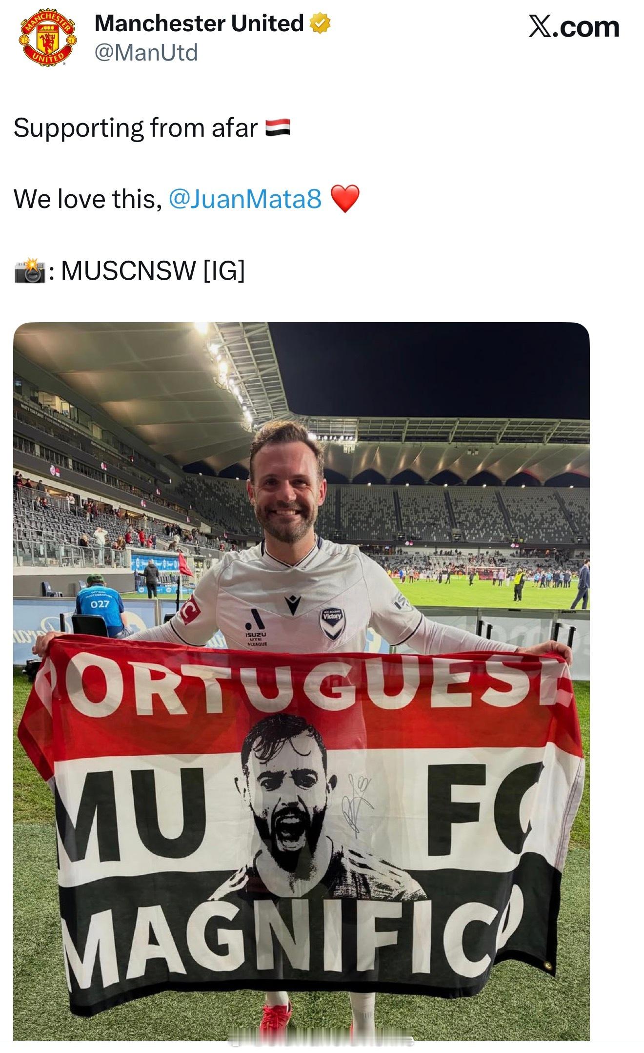 曼联官推发了马塔拿着支持费尔南德斯的旗帜