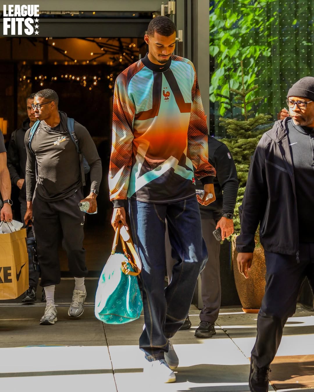 时尚媒体LeagueFits晒出维克托-文班亚马今日穿搭:身披耐克2026FIFA好莱坞守门员系列法国队球衣、手持LVSpeedy25小牛皮挎包。