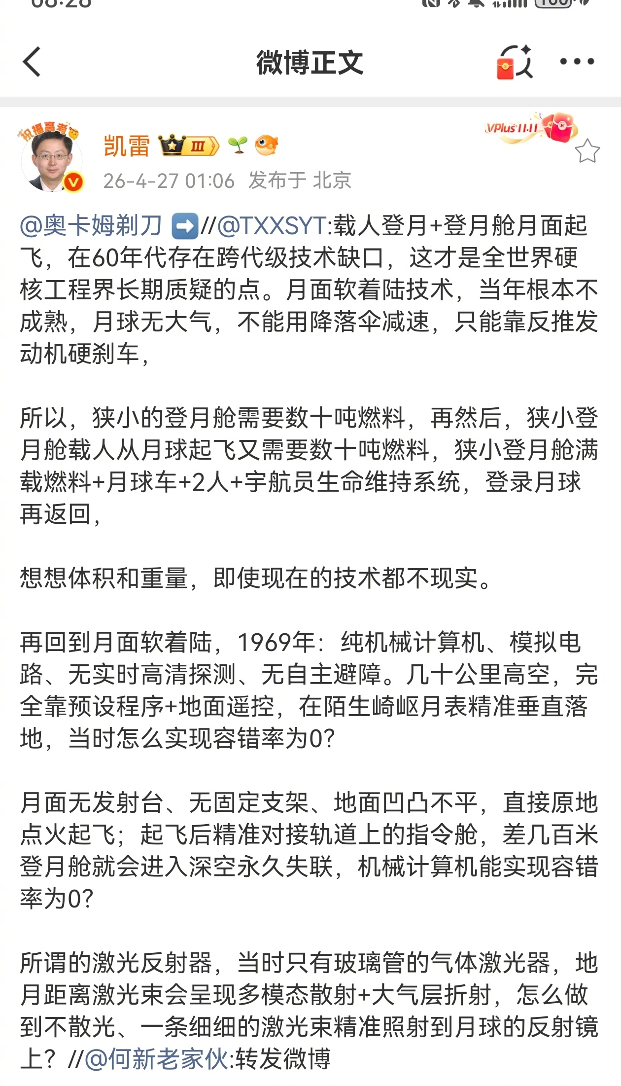 老朋友艾特了我,我觉得并不是所有荒谬观点都有公开讨论的必要,尤其是被中国科学院和国家航天局无数次辟谣的登月阴谋论。