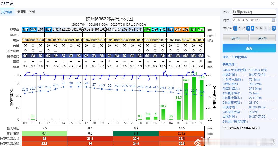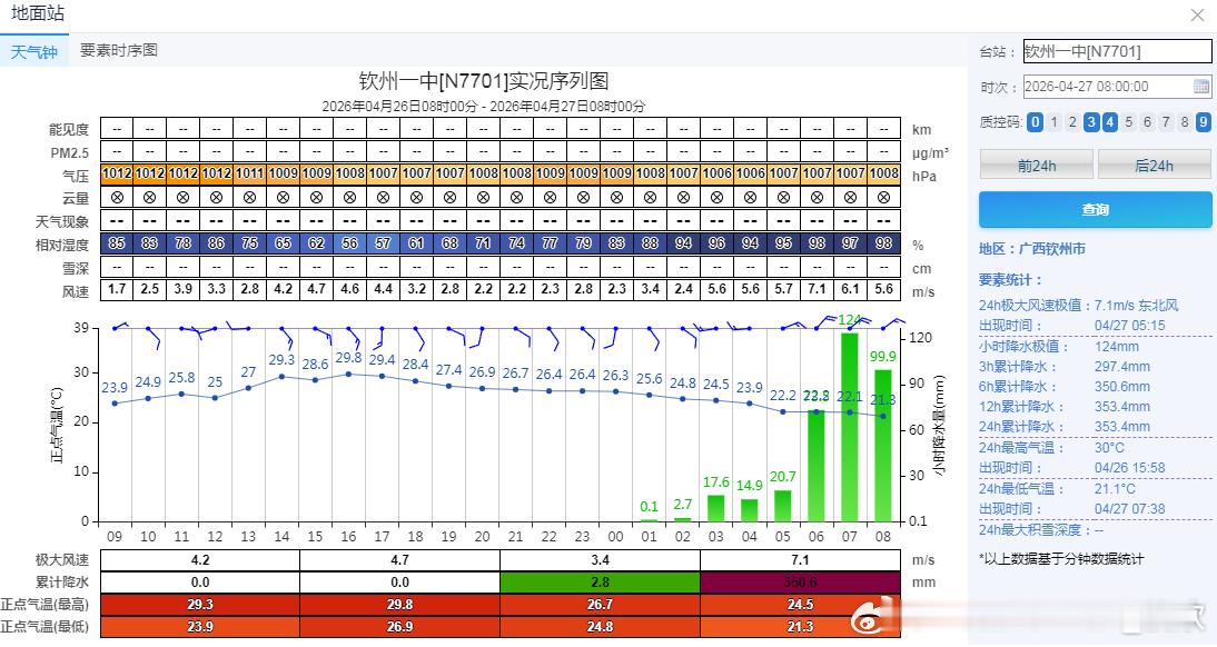【钦州特大暴雨破纪录】今天凌晨-早晨,广西南部的钦州一带,遭遇极强降雨。钦州的国家气象站,降水量271.1毫米,打破当地最早特大暴雨日纪录和4月单日降水量纪录。区域自动站,部分站点超300毫米,达到了特大暴雨级别。