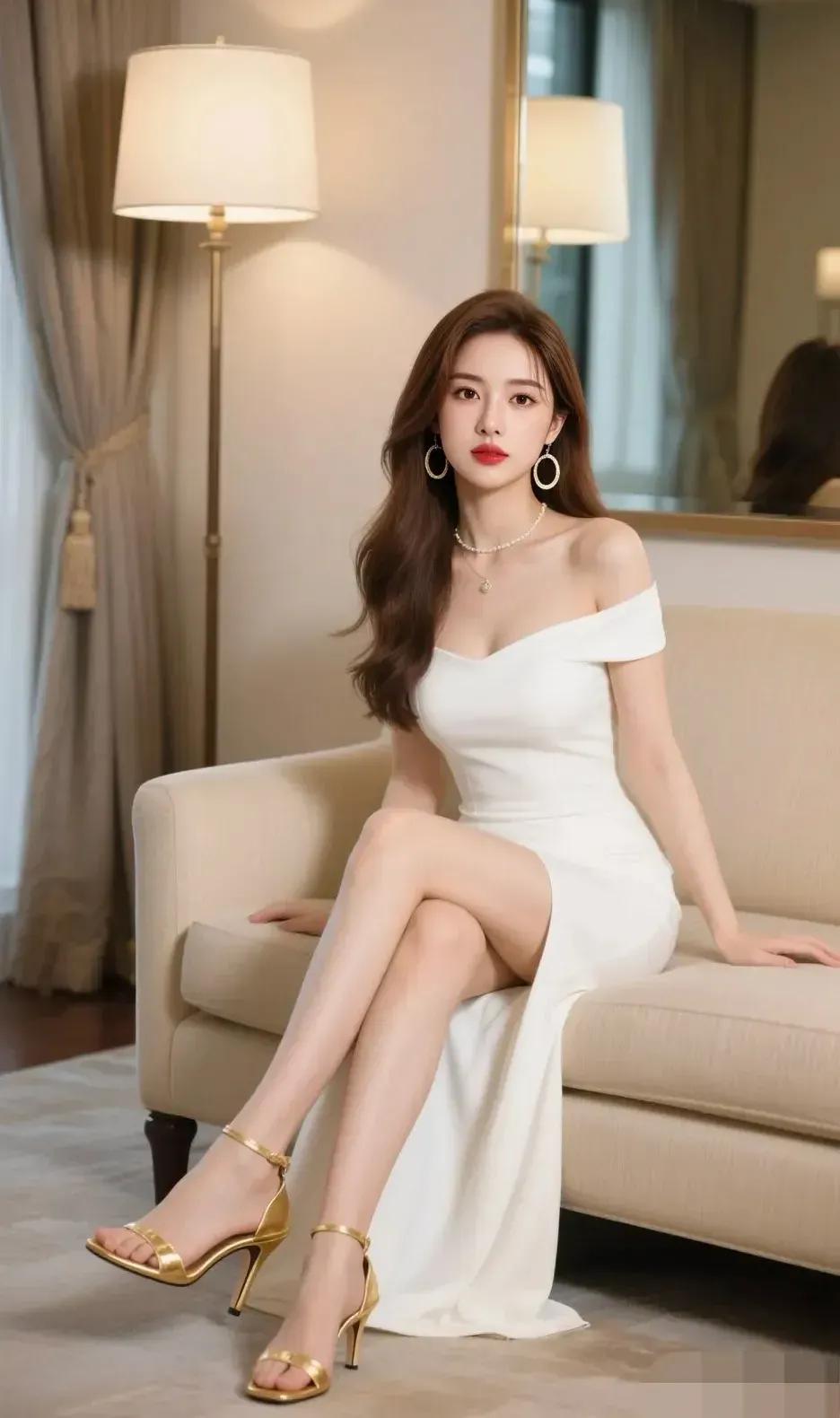 卷发红唇,衣袂生光,慵懒倚坐,尽显优雅模样。