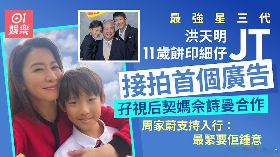 「影壇大哥大」洪金寶的長子、現年51歲的洪天明與2006年港姐亞軍兼「最上鏡小姐」周家蔚(42歲)結婚14年,育有長子洪大仁(TJ)及幼子洪竟琋(JT),一家四口生活美滿。大仔洪大仁已13歲踏入青春期,愈大愈靚仔,獲網民大讚其顏值超越父親,更帶有「韓系Oppa」氣質。不過,細仔洪竟琋最近就率先跑出接拍廣告,更孖住契媽佘詩曼(阿佘)一同出鏡,展現演藝潛質。