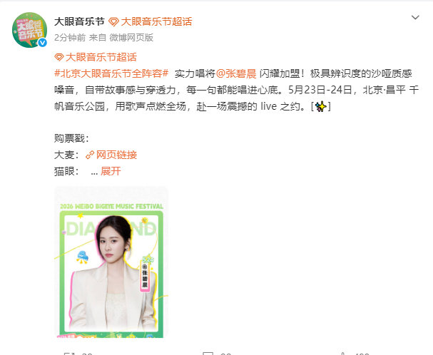 终于等到了。张碧晨官宣大眼音乐节 5月23日-24日北京·昌平千帆音乐公园,现场见。北京大眼音乐节全阵容