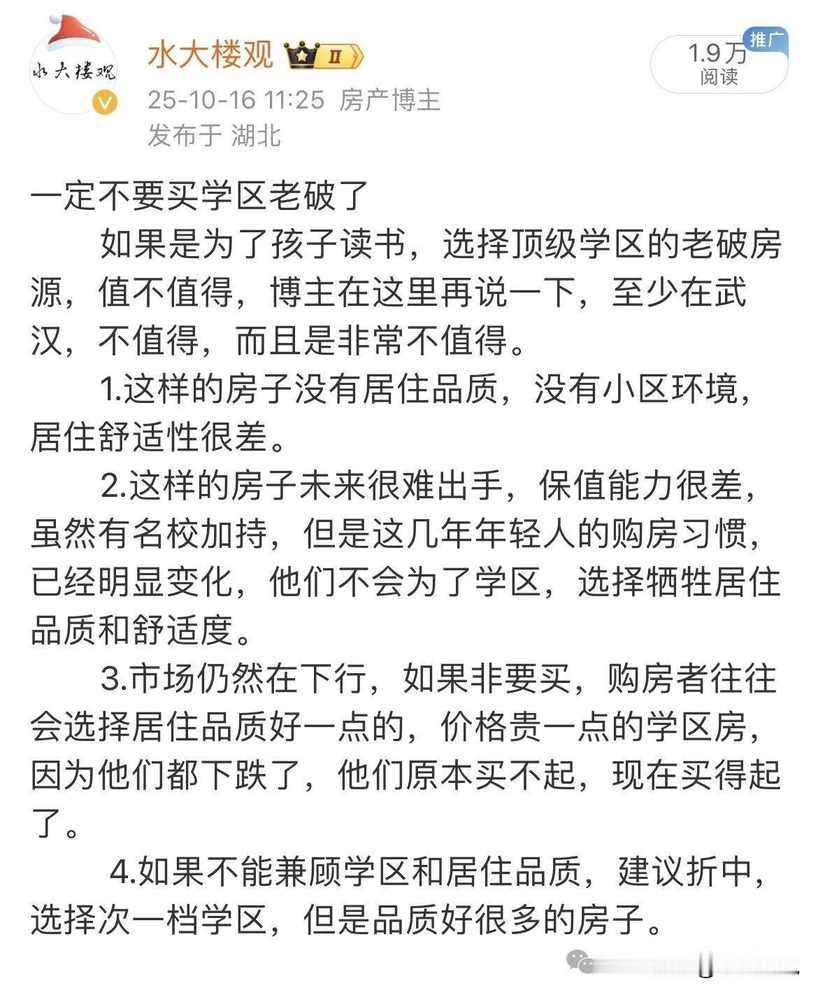 而且市场上的趋势看起来越发的极端,当住和学发生矛盾的时候,在以前铁刚需是学(未来五年的买房技巧(三)收敛到学区---极度刚需时代S071),优先满足学的需求,这是很多人选择武汉小学老破小,育才二小老破小的原因,但是现在的趋势是优先满足住而不是学。举个例子你就懂了,如果预算确实有限,有两个选择,一个是直接冲顶级学区,那就要牺牲居住品质,另一个是把学区从顶级变成次一级,可以买到三房次新,兼顾生活品质,越来越多的人选择后者,而不是无脑冲学区了。这就是为什么武汉小学老破小卖不动,但是百瑞景成为2025年流量盘的原因。