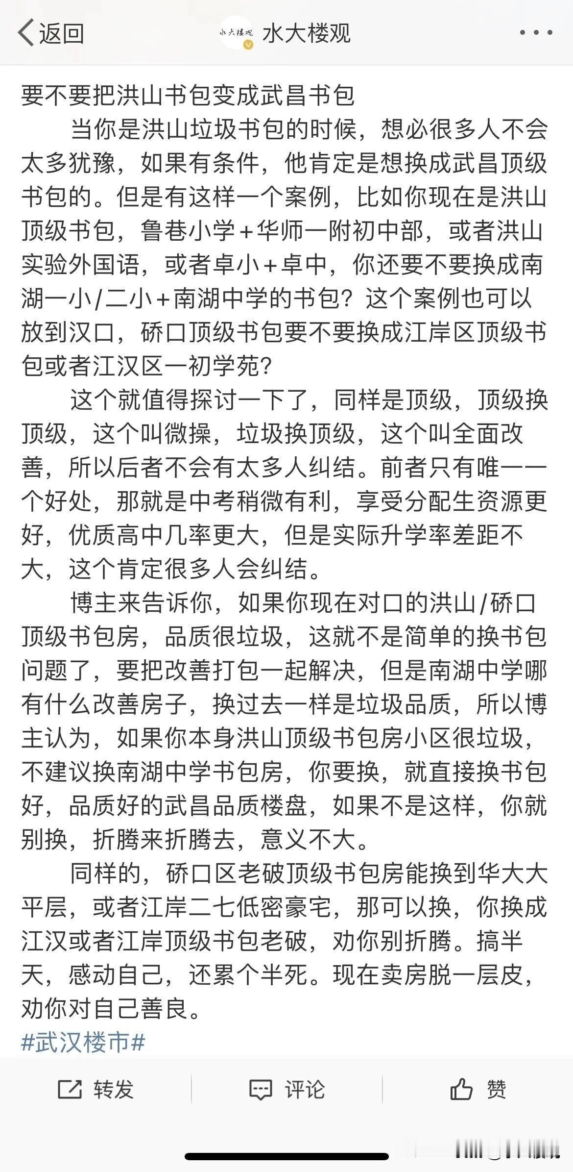 从学为第一,到住学结合。曾经的武汉楼市,在房价高企的时代,流行“住学分离”,即手上预算有限,不可能做到居住品质与顶级书包的统一,那么一般的解决方案就是买一个小的书包房挂学区,在附近买一个大的品质好的居住。但是随着房价的持续下行,越来越多的人选择住学结合,鱼和熊掌要兼得,既要住的舒服有品质,也要把孩子的读书问题解决。