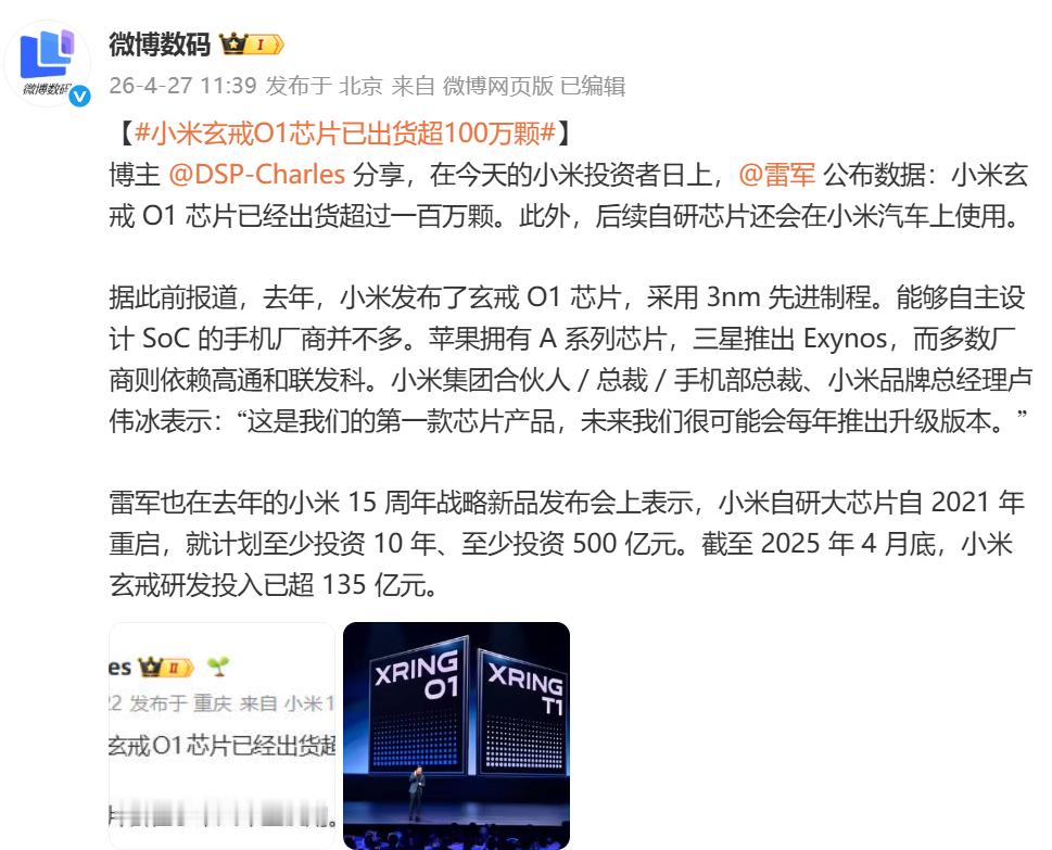 小米玄戒O1芯片已出货超100万颗 没想到小米玄戒O1已经来到100万颗了,当时还有不少人不看好呢~ 接下来还会用到小米汽车上。每年还会推出升级版,可以期待下后面的版本了~